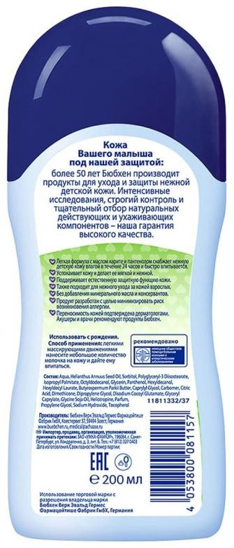 Зволожує і живить ніжну дитячу шкіру. Моментально вбирається, не залишаючи жирного блиску на шкірі. Рекомендується використовувати після кожного прийняття душу або ванни. Також підходить дорослим. До складу молочка входять тільки рослинні олії – каріте, соняшника, а також пантенол. Bübchen в перекладі з німецької - «малюк», девіз компанії Bübchen: «Зворушливий захист». І це не просто красиві слова. Виробники піклуються про здоров'я наших діток, тому використовують для виготовлення засобів по догляду за шкірою тільки натуральні компоненти, екстракти і витяжки з лікарських трав, а також тільки натуральні олії.