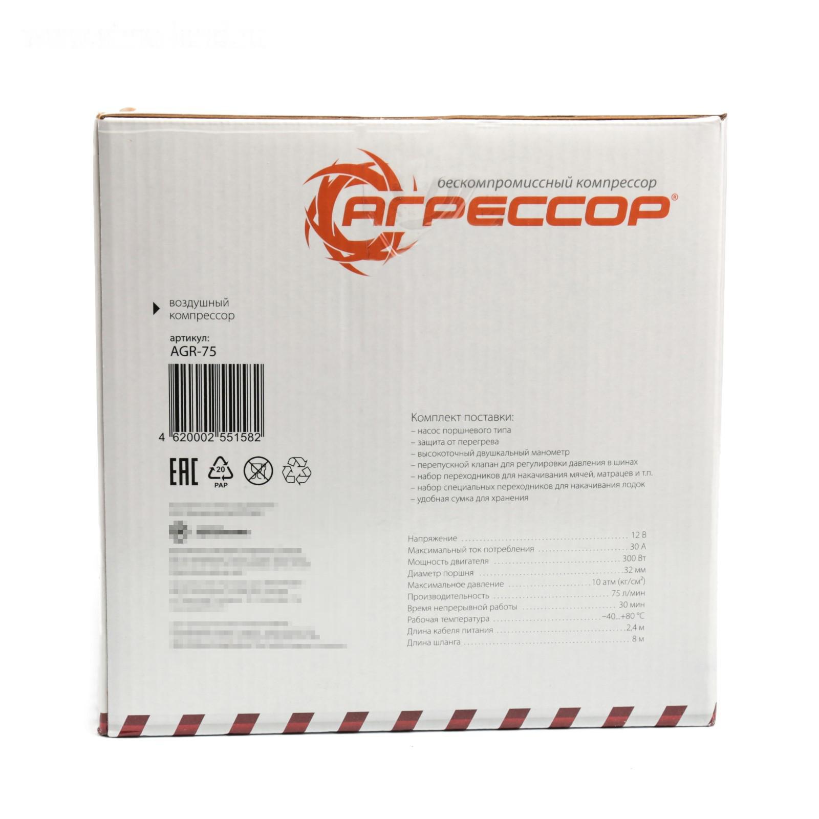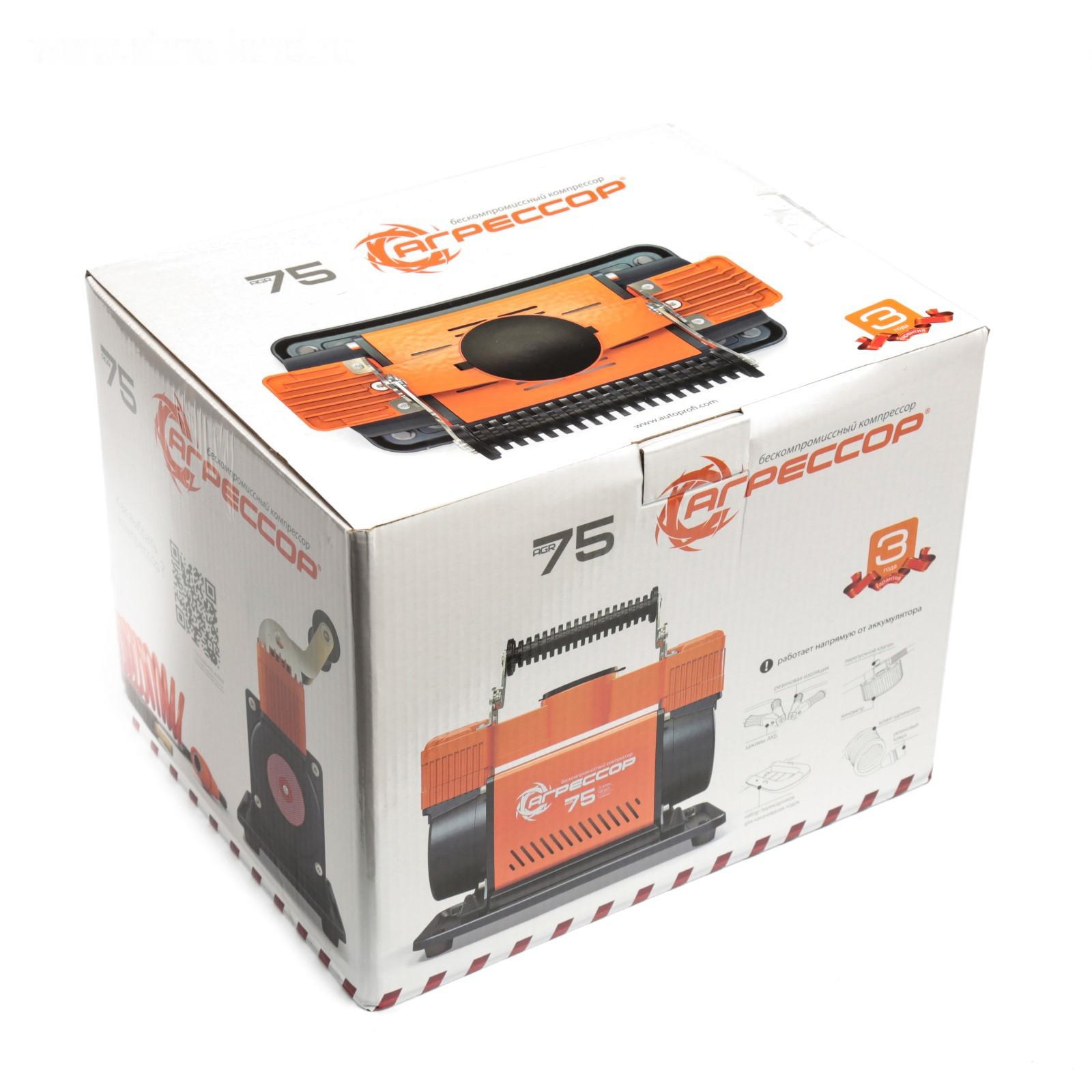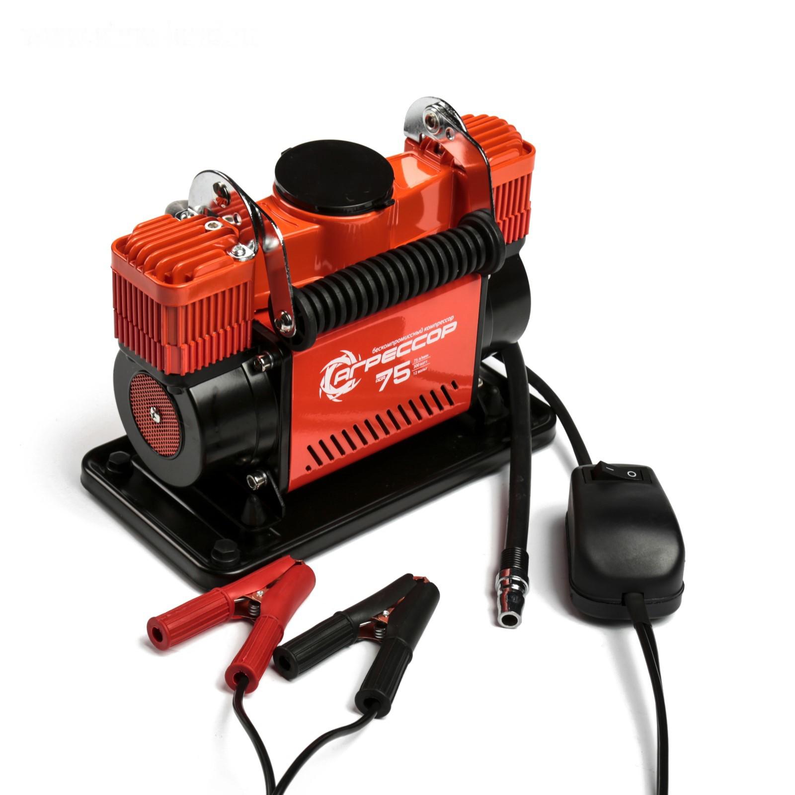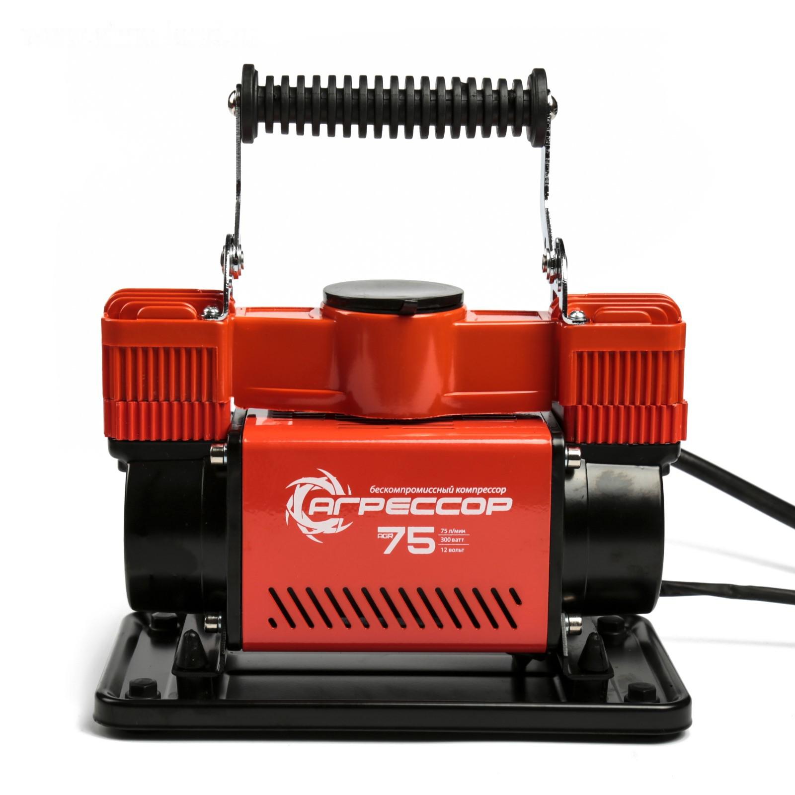 Компрессор автомобильный "Агрессор" AGR-75, двухпоршневой, металлический, 12V, 300W, производительность 75 л/мин, переходники для накачки лодок, сумка