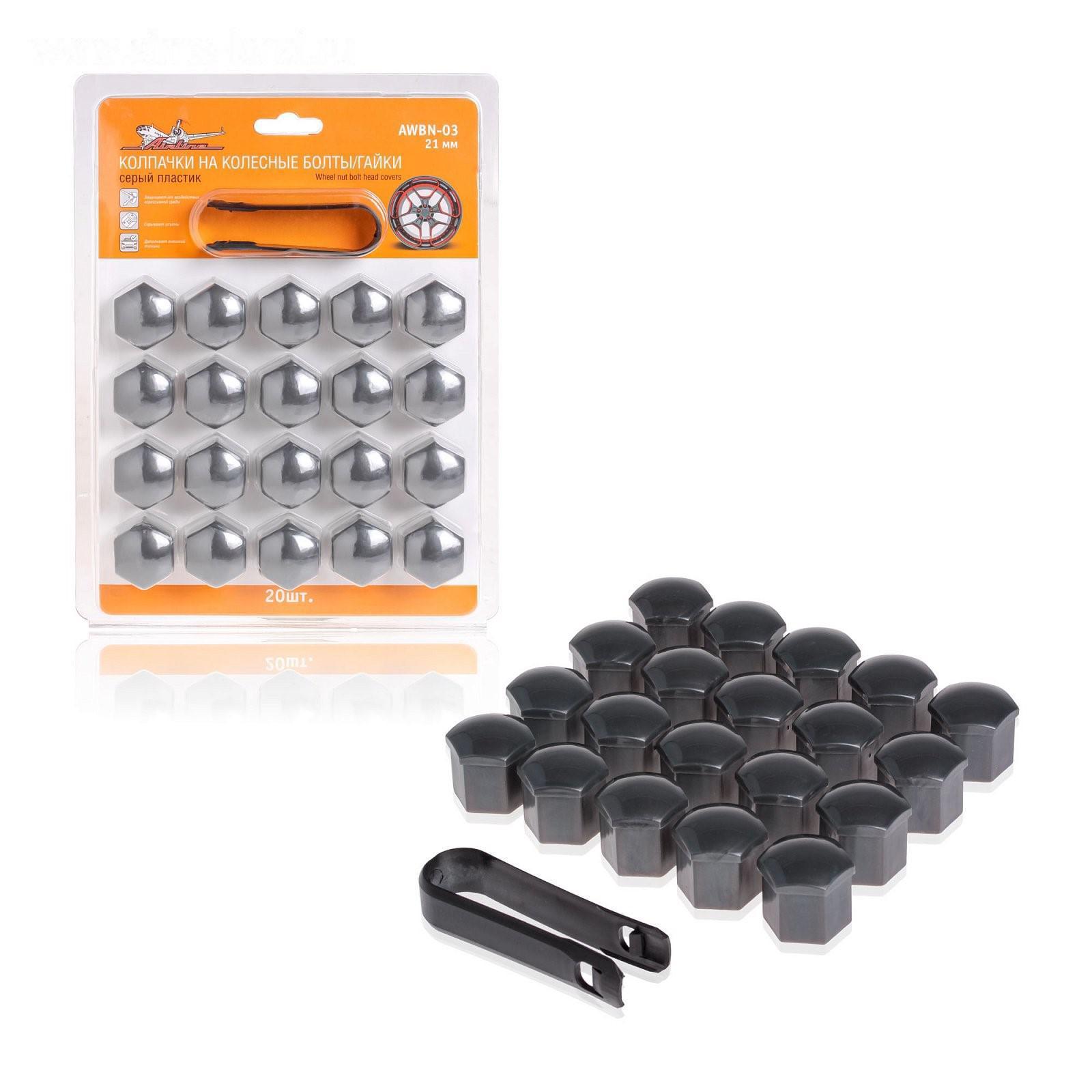 Колпачки на колесные болты/гайки 21 мм, 20 шт.+ съёмник, пластик, серые, AWBN-03