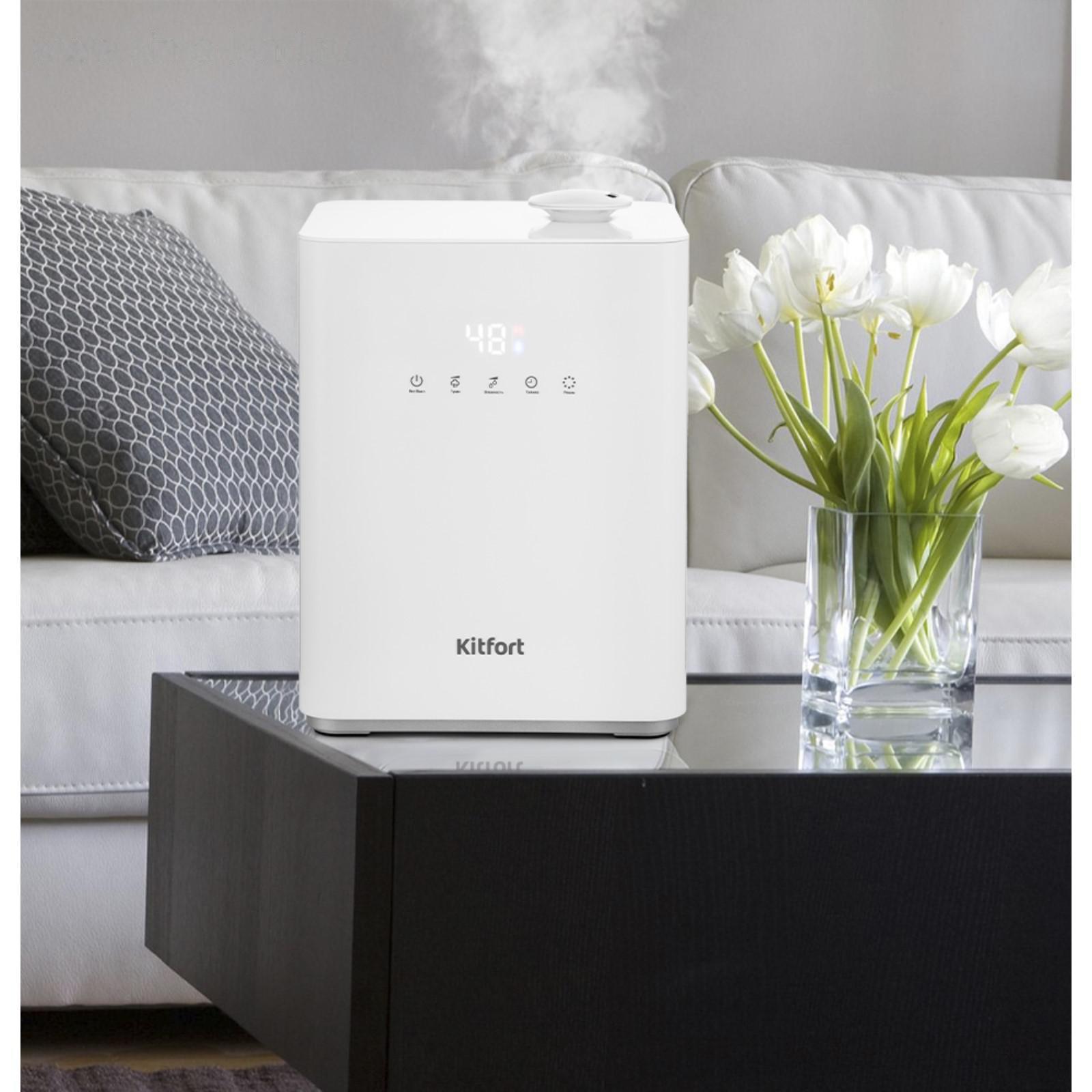 Kitfort KT-2809 увлажняет воздух в помещении и ионизирует его, создавая хороший микроклимат. С помощью кнопок на передней панели можно установить: