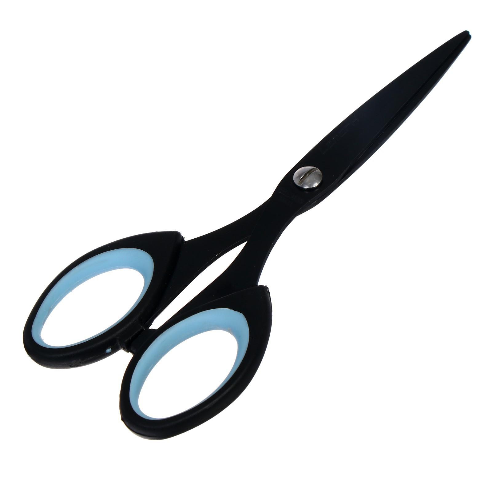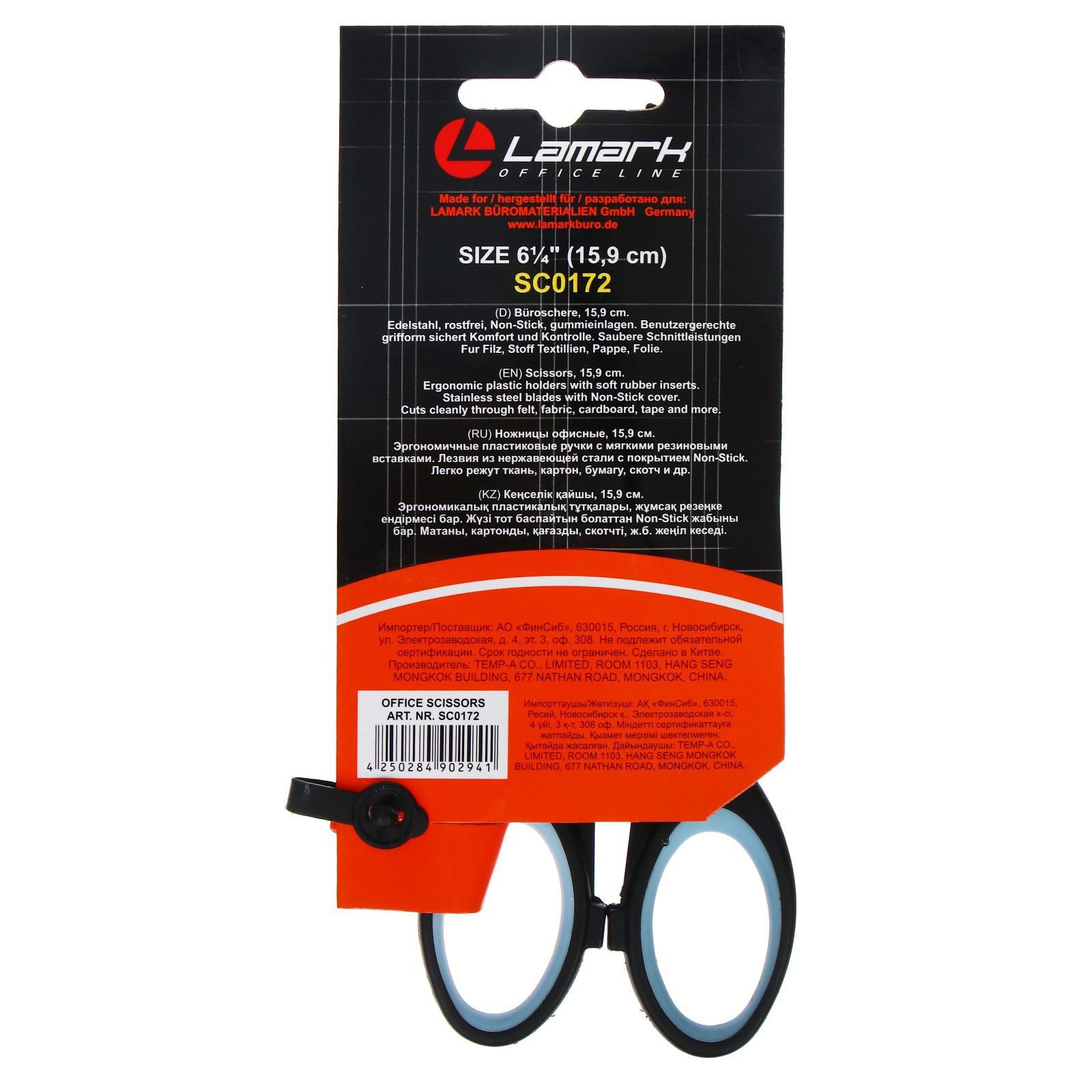 Ножницы канцелярские Lamark из нержавеющей стали с черным покрытием лезвий Non Stick. Эргономичные пластиковые ручки с удобным захватом с синими резиновыми вставками обеспечивают комфортную работу с материалами разной плотности. Размер ножниц 15,5 см. Поставляются в блистере с еврослотом.