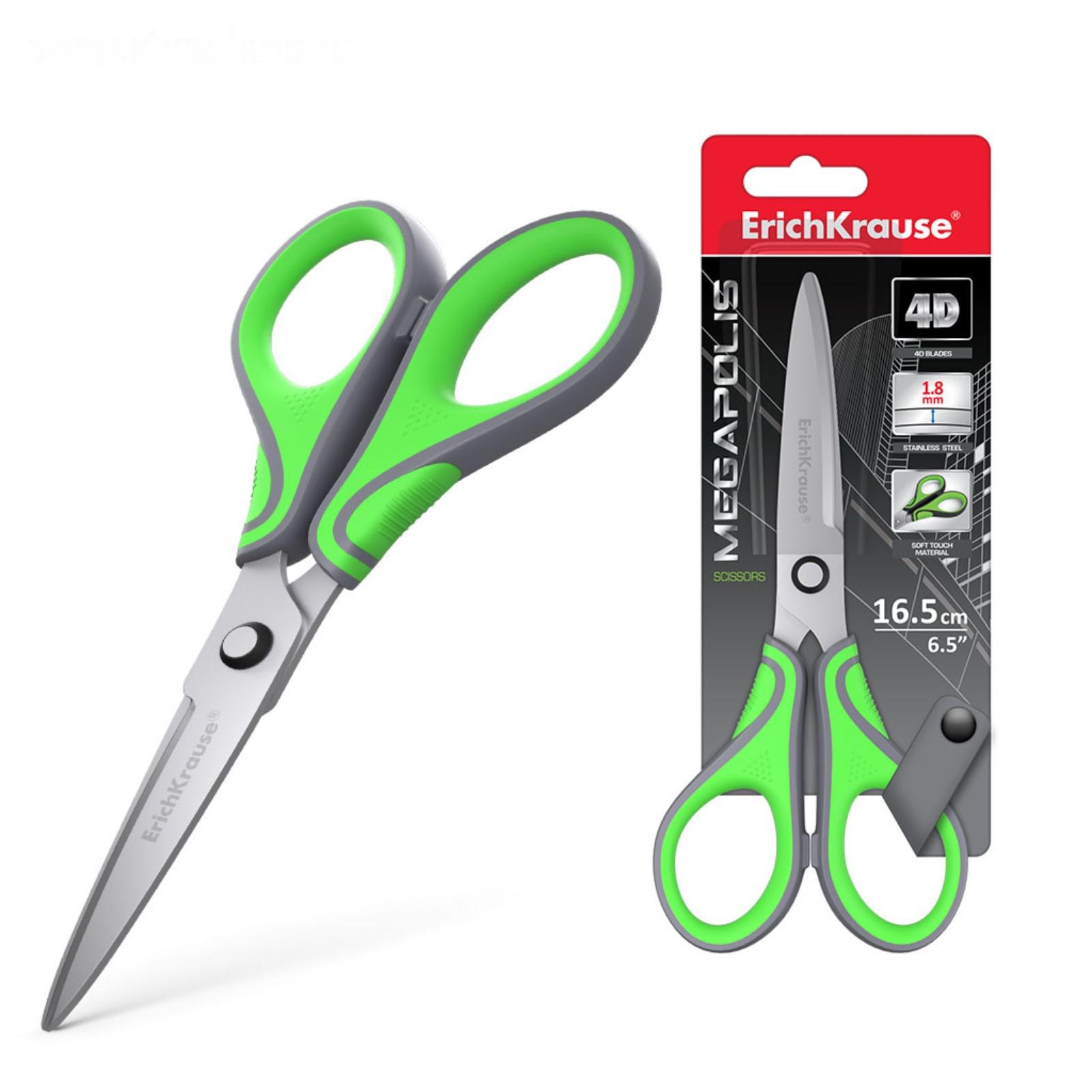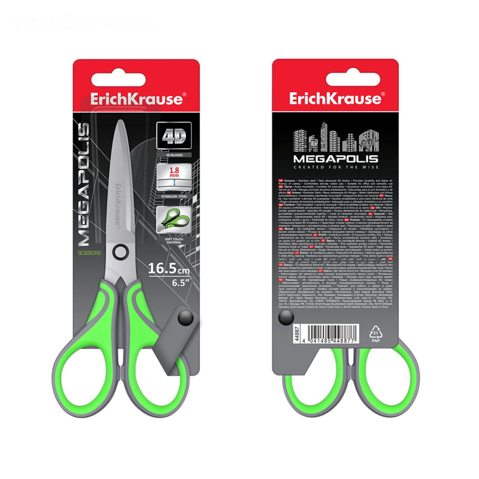 Ножницы ErichKrause Megapolis, 16.5 см, с усовершенствованными 4D-лезвиями, не ржавеют, ручки с резиновыми вставками, в блистере