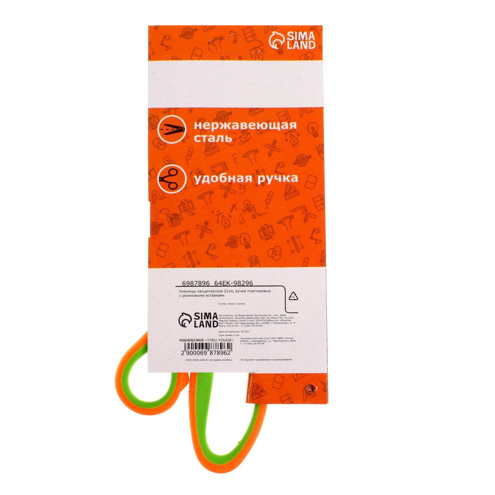 Ножницы канцелярские 21 см, ручки пластиковые с резиновыми вставками, МИКС