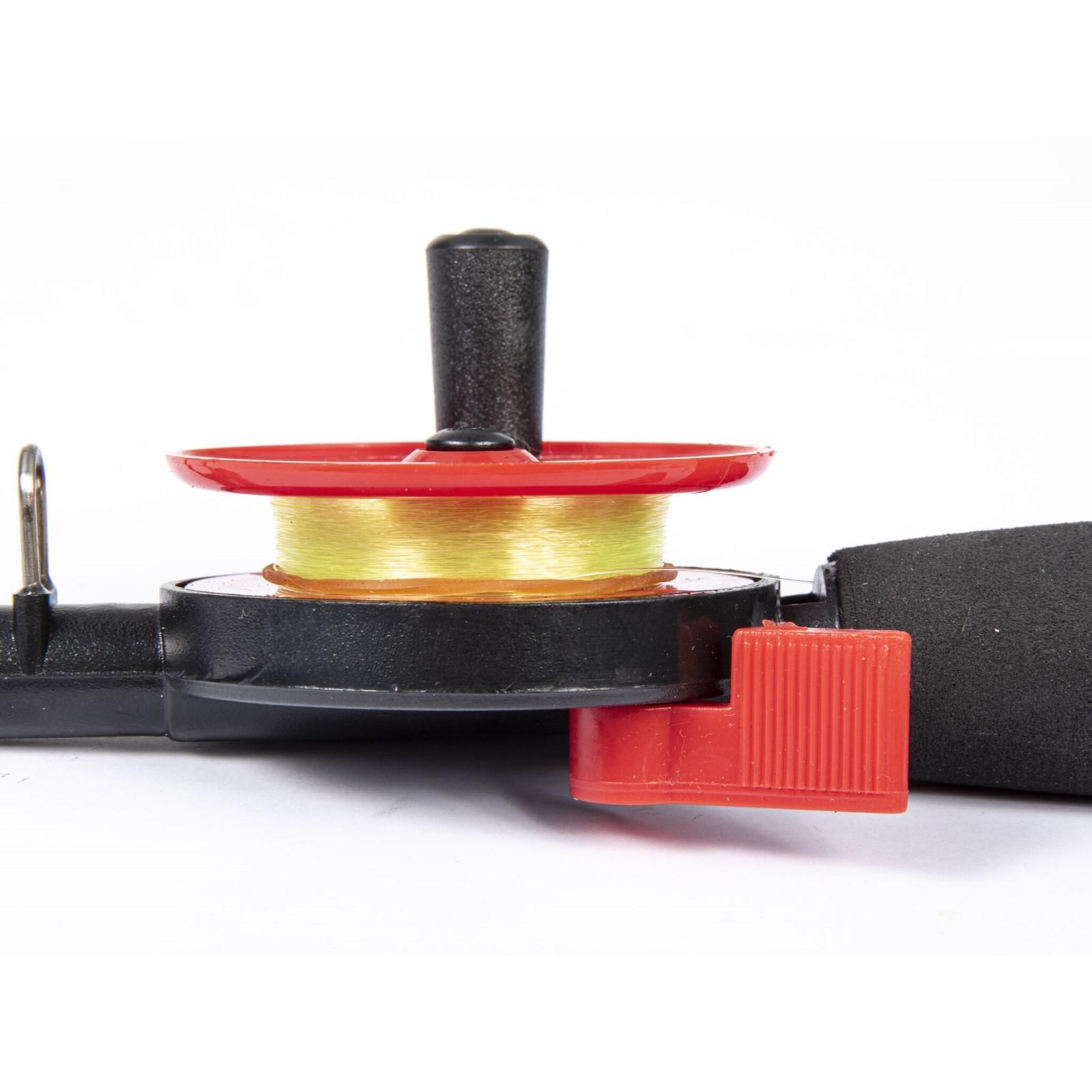 Комплект зимней удочки с блесной и намотанной на шпулю леской. Удочка с открытой шпулей, короткой неопреновой рукояткой и клавишным стопором. Хлыстик оснащён металлическим тюльпаном с керамической вставкой.