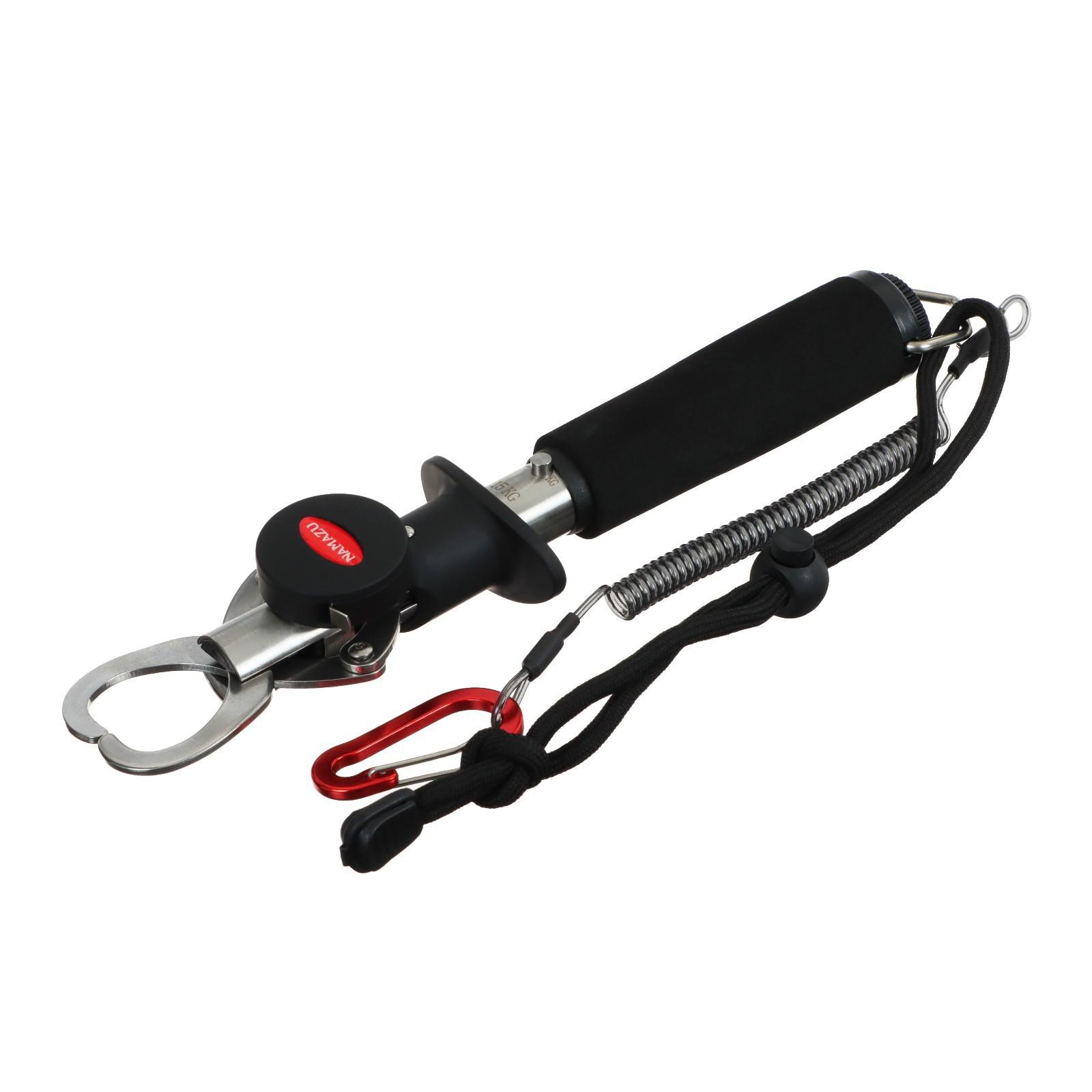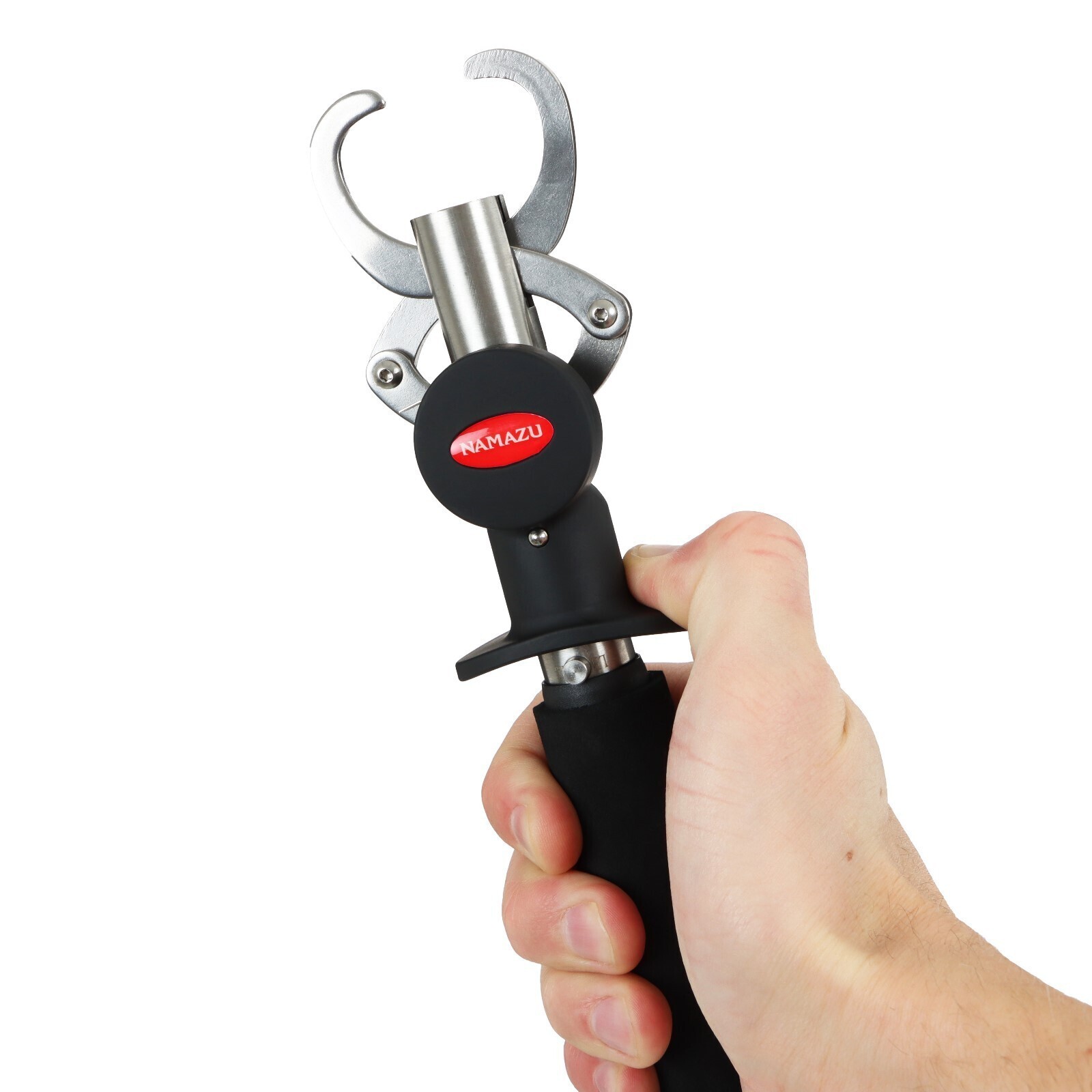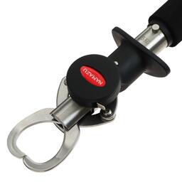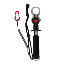 Специальное приспособление для вытаскивания из воды щуки, схватившей крупную приманку, оснащенной тройниками. Он также полезен для приверженцев C&R, так как минимально травмирует рыбу. Принцип действия основан на плотном смыкании металлических дужек за нижнюю челюсть рыбы. Кость нижней челюсти достаточно прочна, так что рыба не сорвется и не травмирует ее. Немного хлопотное заведение устройства в рот бьющейся рыбы с лихвой окупается тем, что вы не пачкаете руки, не травмируете рыбу и не выпутываете тройники из сетки подсачека. Для удобного хвата рукоять покрыта мягким ЭВА, который не будет выскальзывать из влажных рук. Для подстраховки есть также шнурок с кнопочным фиксатором и ретривер, чтобы закрепить инструмент, например, на поясе. Весы встроены в рукоять, максимальное значение шкалы - 18 кг.
