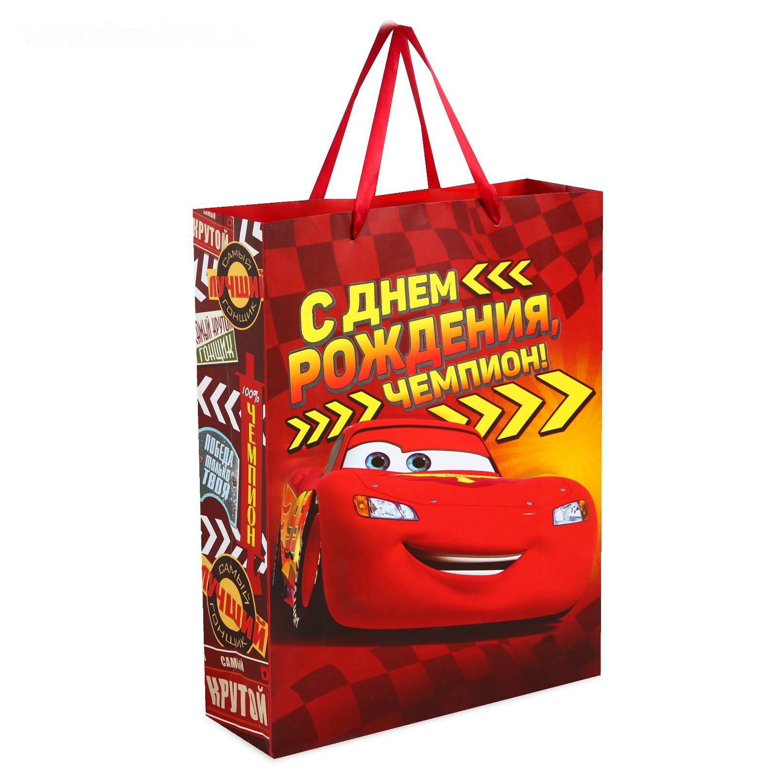 Пакет ламинированный вертикальный "С Днем рождения, чемпион!", Тачки, 31 х 40 х 11 см