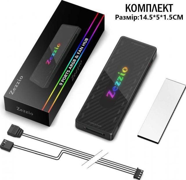 Хаб Zezzio 1 to 9 ARGB & PWM HUB призначений для розширення можливостей ARGB контролера версії 5В 3Пін, вбудованого в материнську плату або зовнішнього ARGB контролера. У нього можна одночасно підключити підсвічування до дев’яти вентиляторів, світлову стрічку або інші джерела світла. Так само Хаб підтримує управління оборотами дев’яти вентиляторів з підключенням 4Пін PWM.