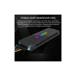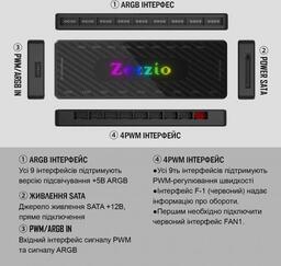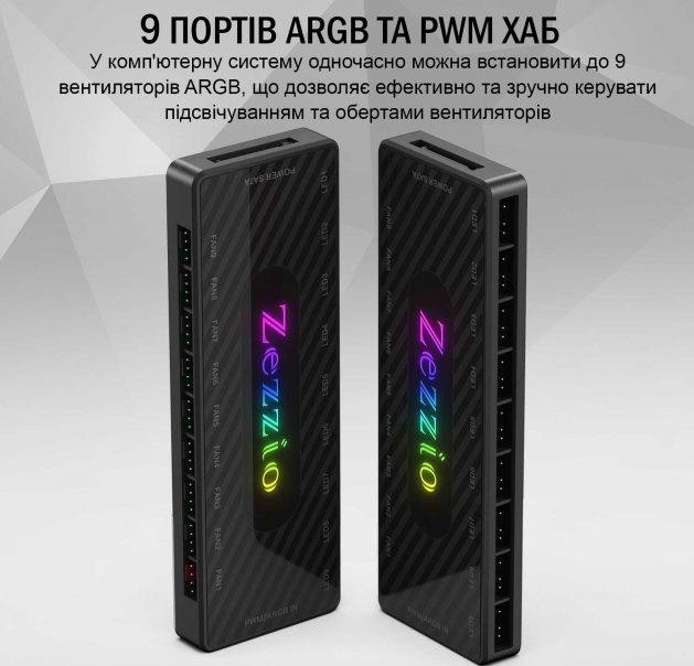 Хаб Zezzio 1 to 9 ARGB & PWM HUB має дев’ять роз’ємів для підключення підсвічування з одного боку і дев’ять роз’ємів 5В 3 Пін ARGB з іншого боку корпусу, а також один роз’єм додаткового живлення версії SATA.