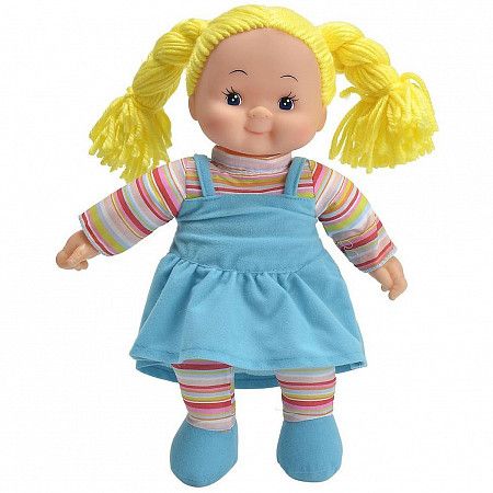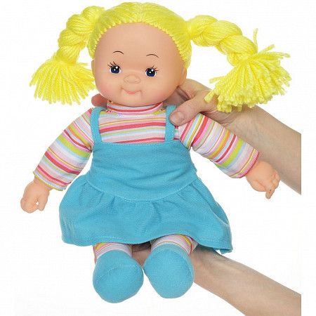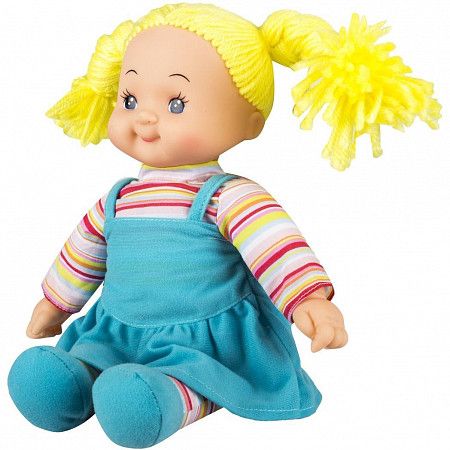 Simba 105112238 Кукла тряпичная Долли,40 см Моя мягкая кукла – очаровательная и очень приятная на ощупь. Ее можно брать с собой спать, ведь она вся такая мягкая. Из пластмассы сделаны только голова и кисти рук. Все остальное – из ткани. Набивка – полиэстер. У куколки большущие синие глаза, длинные ресницы, улыбающиеся губки и пухлые щечки. Пышные волосы сделаны из шерстяных ниток – их нельзя причесывать обычной расческой, зато они не так сильно путаются, и их удобно заплетать в косы. Кукла целиком «одета» в полосатый не снимаемый комбинезон, на руках переходящий в рукава. На шее – воротничок-стоечка. А на ногах – не снимаемые башмачки в тон наряду. Кукла с бежевыми волосами, заплетенными в тугие торчащие косички, в фиолетовом платье с расширяющейся книзу юбкой и двумя рядами рюшек на груди. Размер куклы: 38 см Для детей от года Изготовитель: Китай