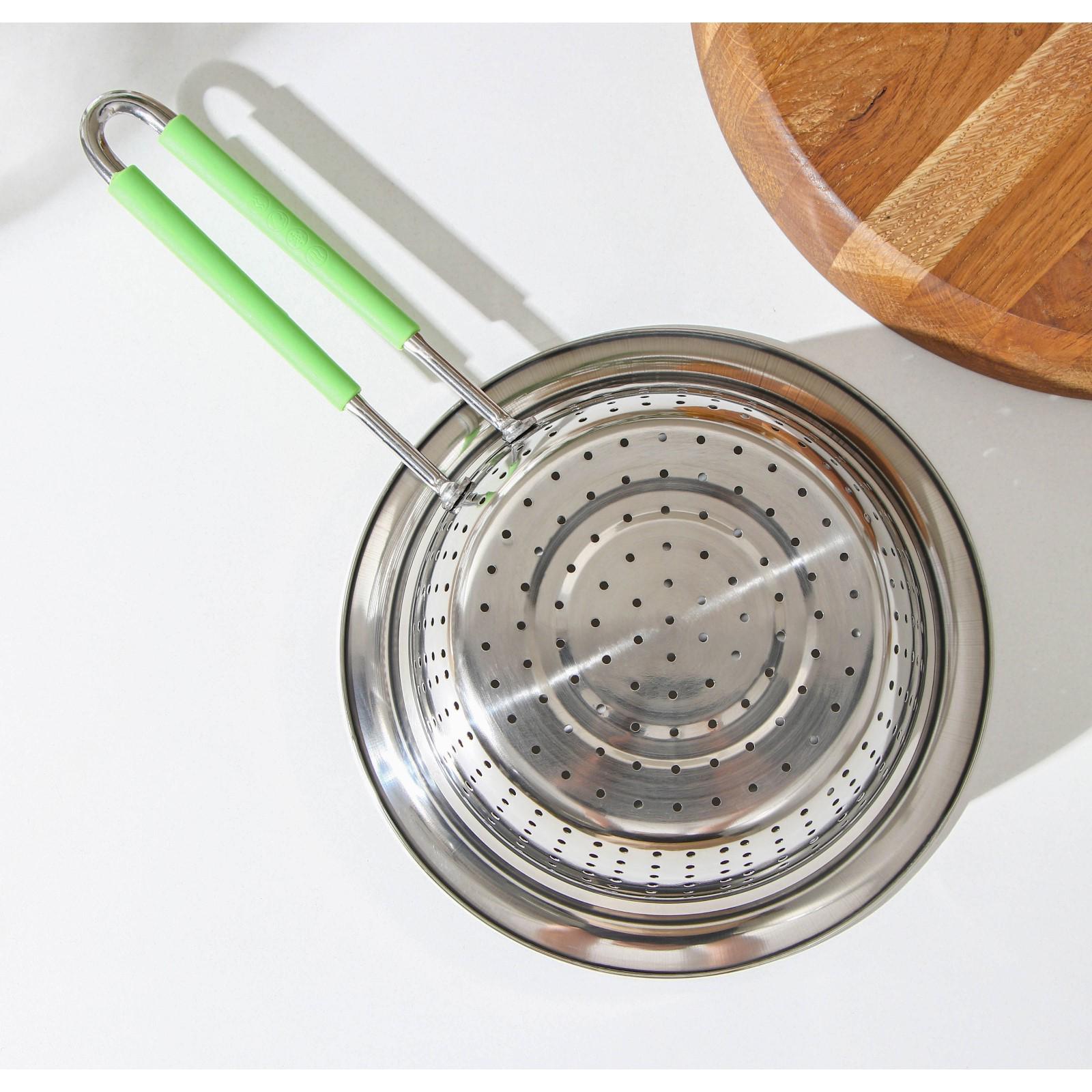 Дуршлаг изготовлен из качественной нержавеющей стали и имеет удобную ручку. Такой посудой легко пользоваться и легко мыть.
