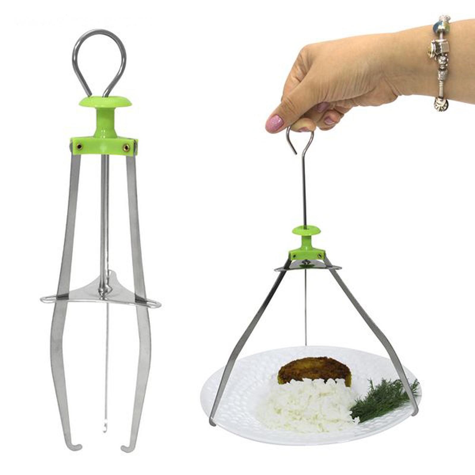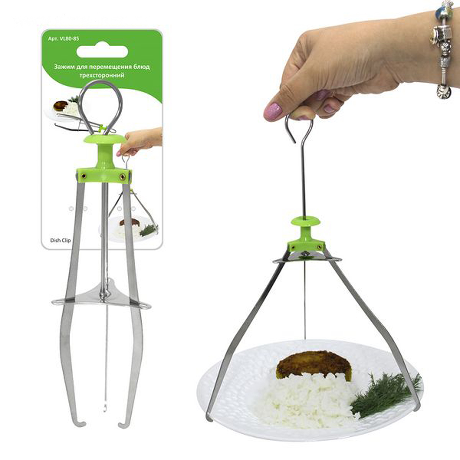 Трехсторонний зажим для блюд – идеальное приспособление для аккуратного перемещения горячих тарелок. Подходит как для новичков, так и для профессонавльных поваров, может использоваться повседневно или для подачи особенных блюд. Основное назначение – помочь избежать ожогов при перемещении горячих тарелок. Приспособление состоит из 3-х крюков, которые равномерно захватывают посуду. Механизм, расположенный посередине – ползающий держатель, позволяет зафиксировать зажим под нужный размер тарелки и регулировать его. Использование: опустите зажим над тарелкой и поднимайте вверх до тех пор, пока крюки не зацепят ее и в таком положении и перенесите горячее блюдо. После использования промойте в проточной воде с использованием жидких моющих средств. Изготовлено из металла и пластмассы (полипропилен).
