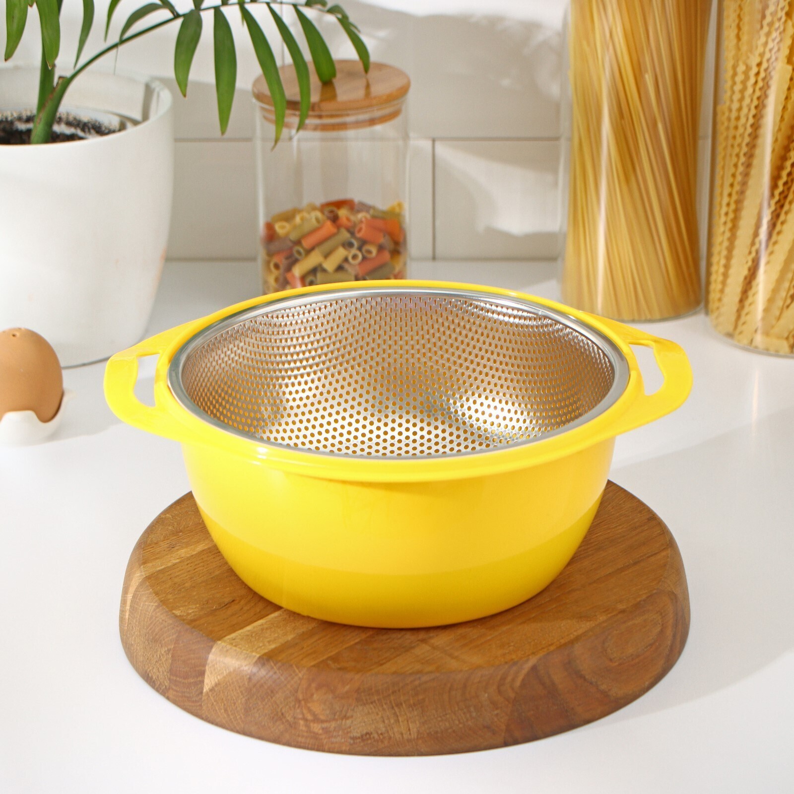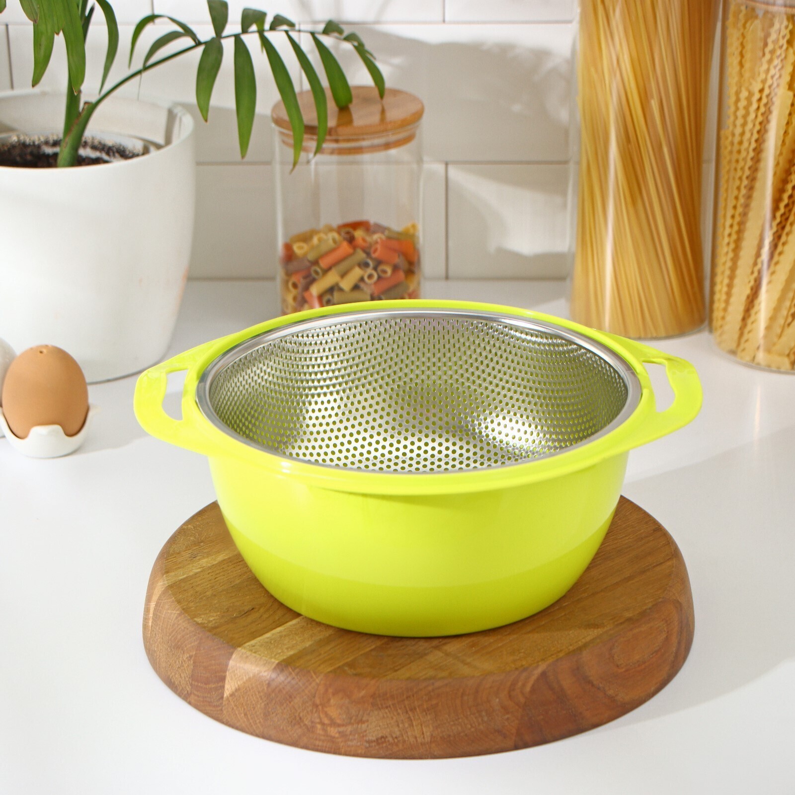 Дуршлаг идёт в комплекте с пластиковой миской. Глубина дуршлага позволяет промывать большие порции продуктов. Ушки-держатели по бокам миски удобно фиксируют сито на стенках во время использования.