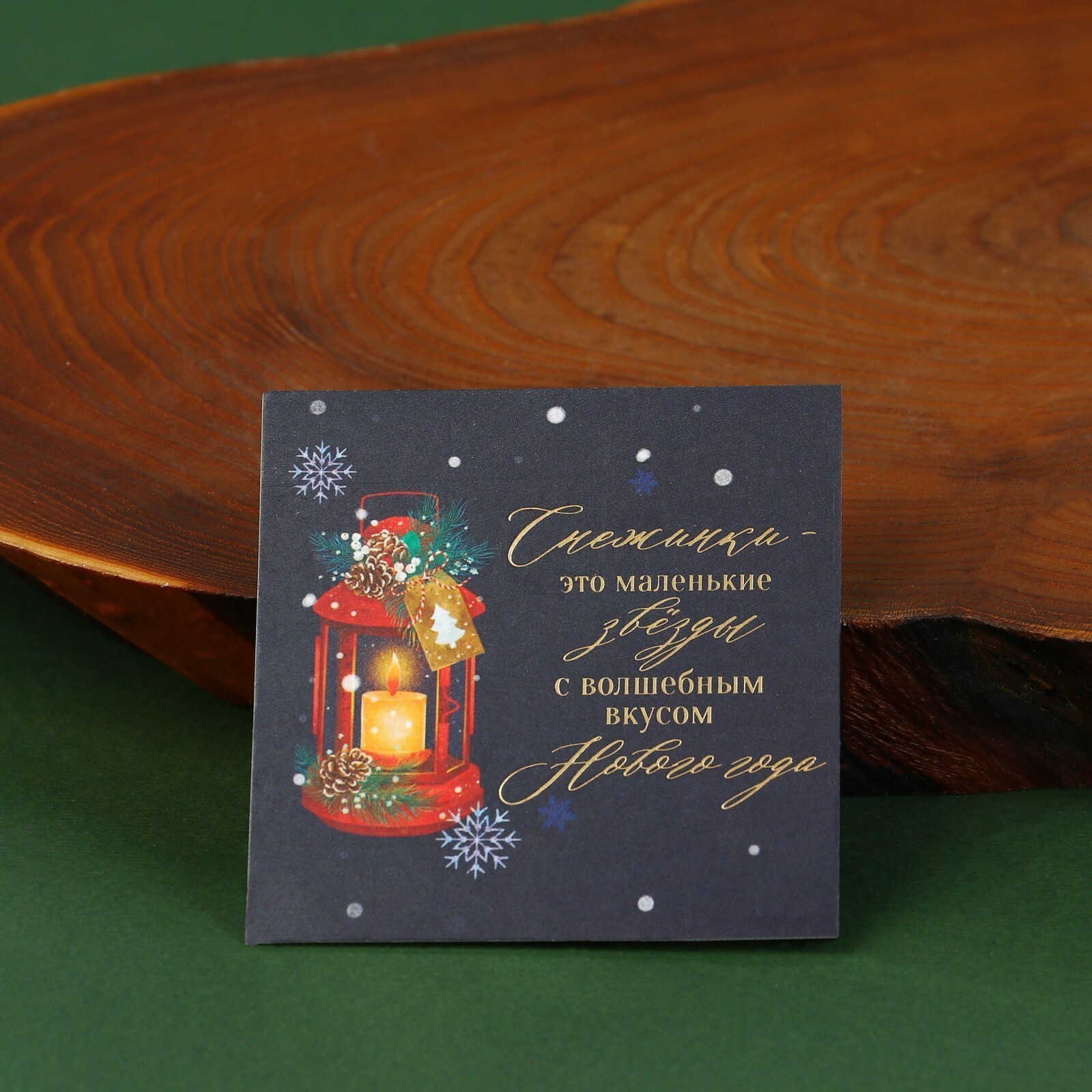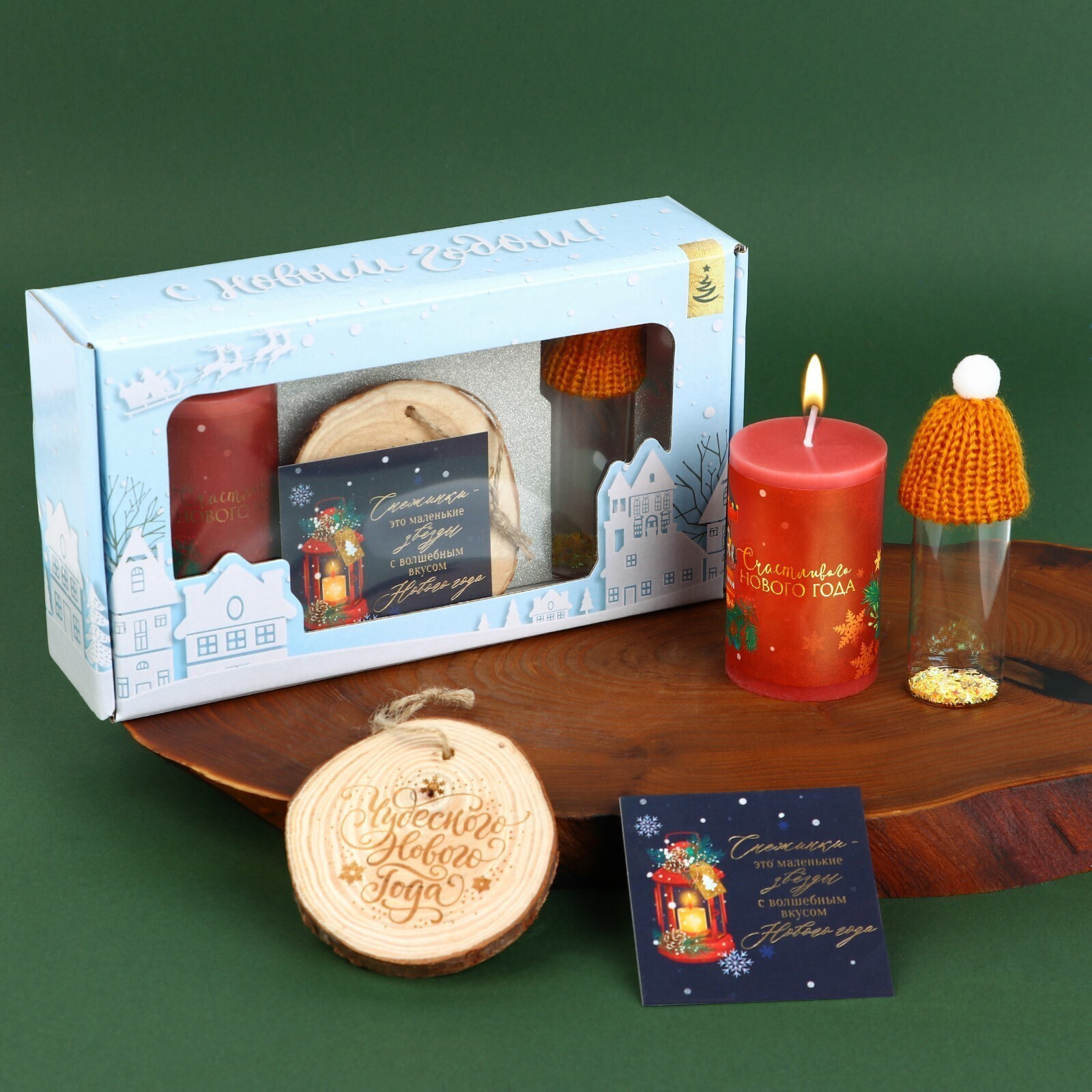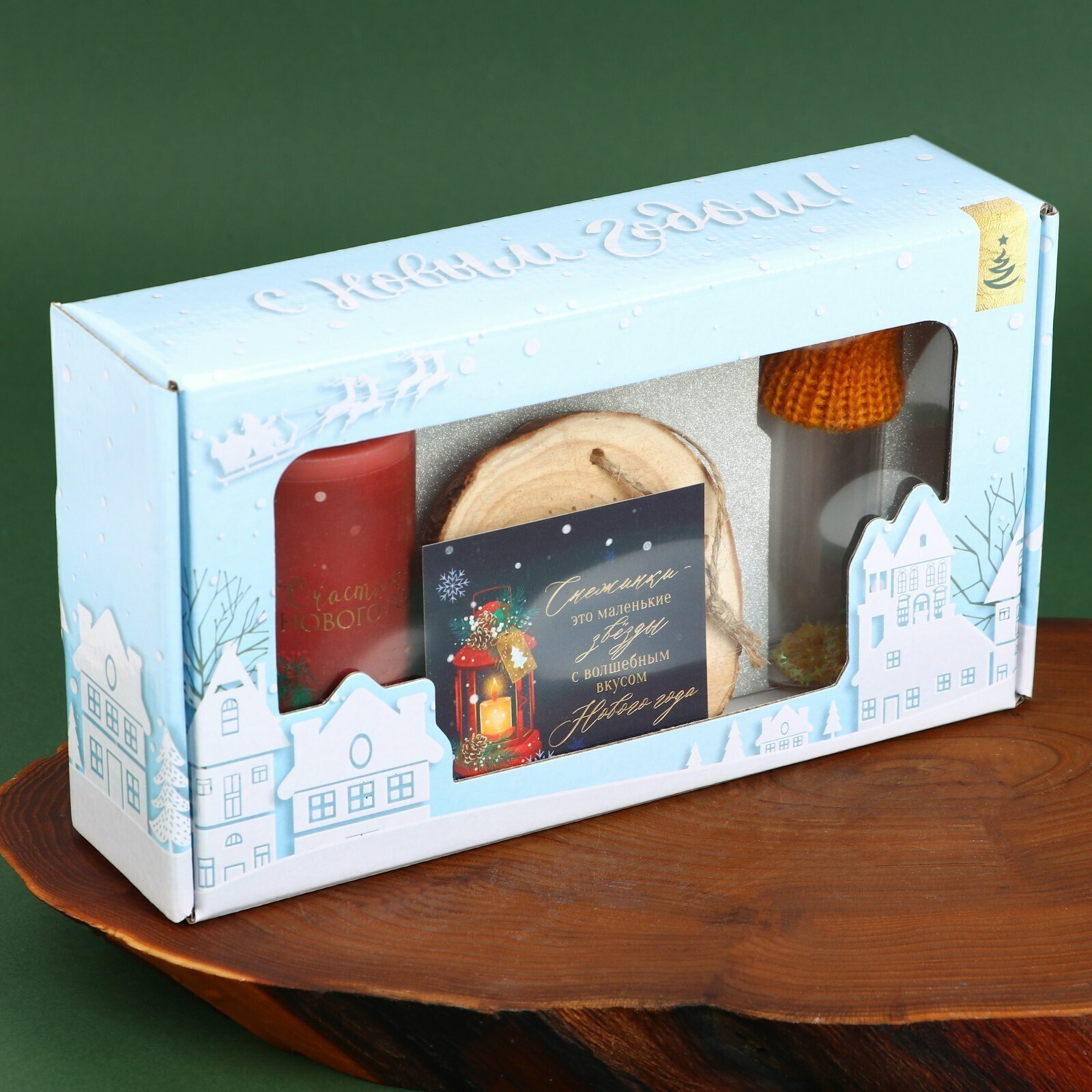 Новогодний набор со свечой подойдёт в качестве украшения на праздничном столе, которое создаст праздничное настроение, а также может быть прекрасным подарком. Набор состоит из свечи (без аромата) 5 х 7 х 5 см, деревянного сруба, диаметром 7,5 см, стеклянной баночки для ваших пожеланий, размером 2 х 2 х8 см, декорированной текстильной шапочкой, размером 5,4 х 5 х 3,5 см. и оригинальной открыткой - 7 х 7 см.