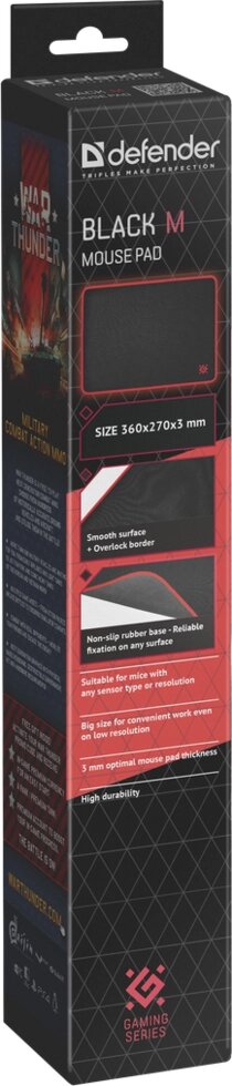 Коврик для мыши Игровой Defender Black M, 360x270x3 мм, ткань+резина 50560