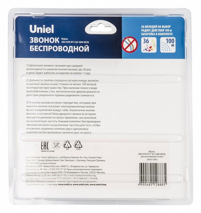 Дополнительная информацияПроизводитель Uniel. Необходимые компоненты - 4 батарейки АА. Компоненты, входящие в комплект - нет. Дополнительные параметры - количество мелодий - 36 шт., радиус действия - 100 м.. Основной цвет - черно-белый