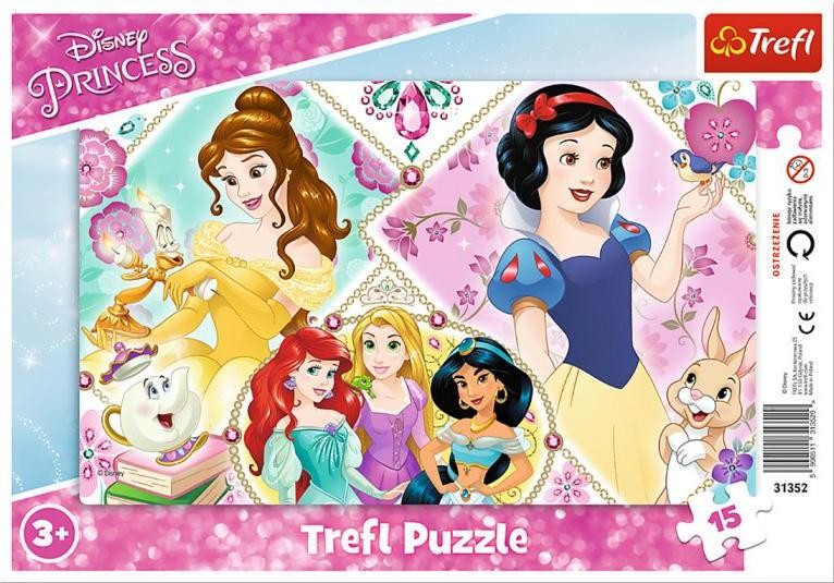 Для маленьких дівчаток торгова марка Trefl створила пазл Trefl Frame Милі принцеси 15 ел. На пазлах зображені чарівні принцеси з серіалів Уолта Діснея. Елементи пазла поміщені в декоративну рамку, за допомогою якої дитина зможе зібрати пазл і з легкістю його переносити з місця на місце. Збираючи такий пазл, діти будуть не тільки весело проводити час, а й розвивати дрібну моторику та уважність.