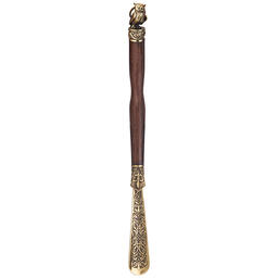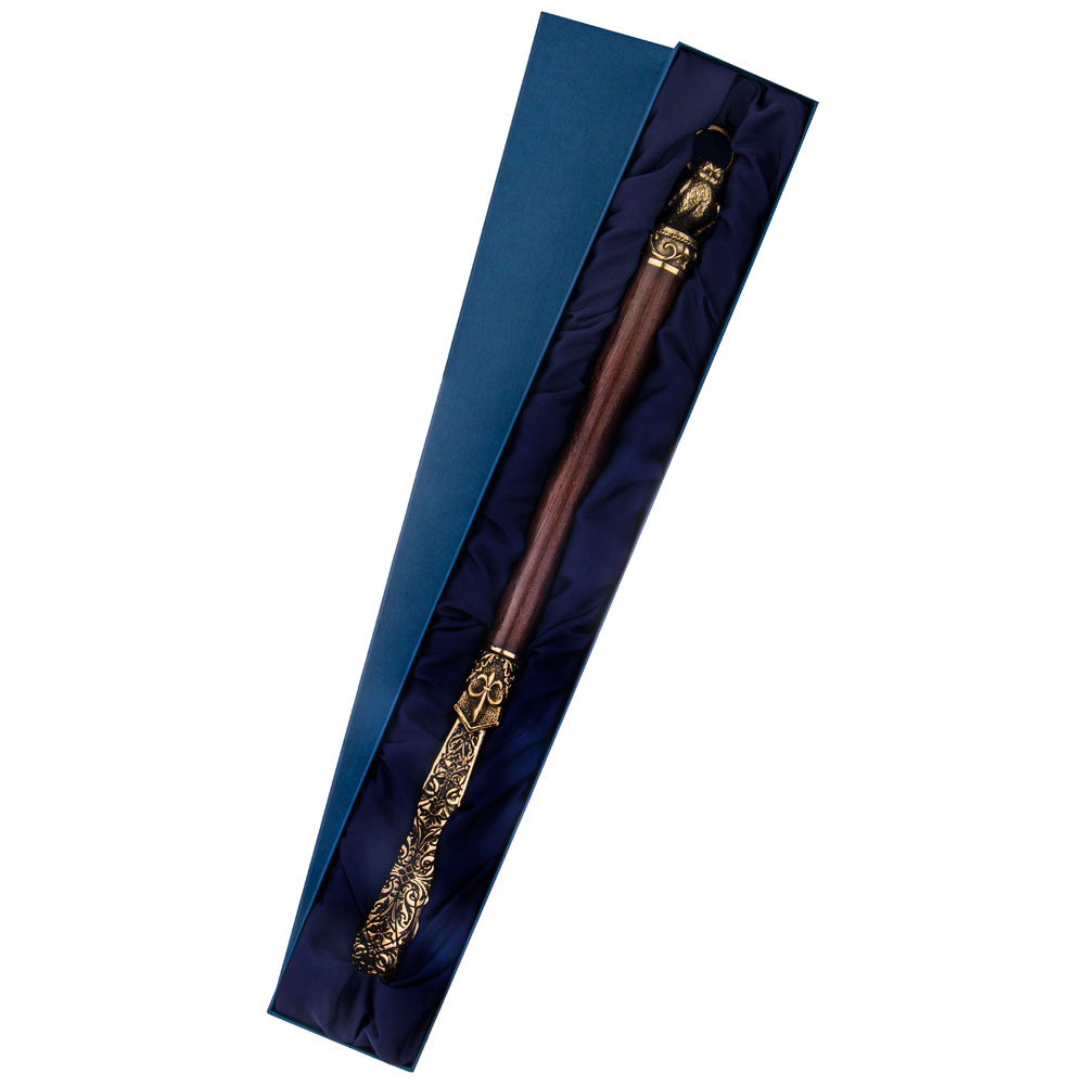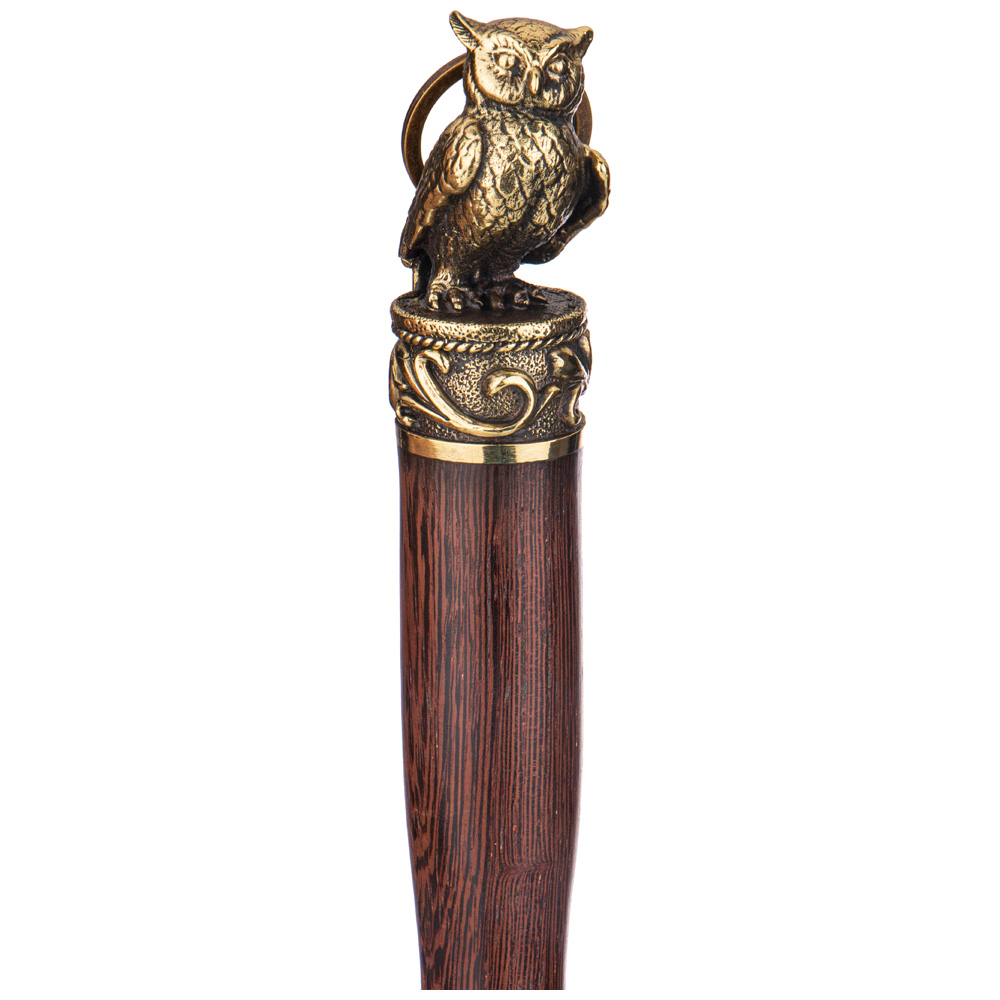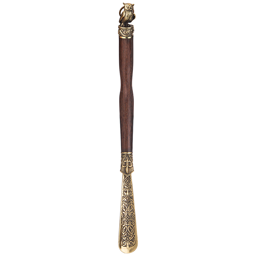 Фигурка совы на рукоятке и рабочая поверхность обувного рожка изготовлены из бронзы методом художественного литья. Мастер тонко переда мельчайшие детали изображения – вырисованы перья, когти, глаза, растительный узор. Обувную ложку с совой можно подарить философу, бизнесмену, так как по поверьям эта птица символизирует мудрость, а по другим трактовкам – приносит успех и удачу.