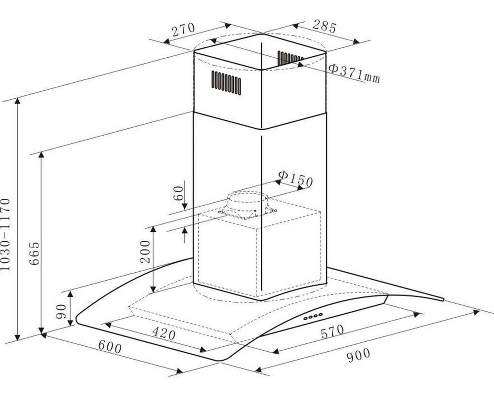 Оригинальная кухонная Т-образная вытяжка шириной 90 см со стеклянной арочной накладной панелью. Монтируется на стену над поверхностью плиты и может функционировать в двух режимах – отвода (при подключении вытяжки к системе вентиляции) и рециркуляции (при использовании сменного угольного фильтра в вытяжке).Корпус выполнен из матированной нержавеющей стали. Большая площадь рабочей поверхности с 2-мя алюминиевыми жироулавливающими фильтрами позволяет эффективно очищать загрязненный воздух на кухне большой площади (до 20 кв.м). Фильтры легко вынимаются из вытяжки и в случае необходимости полностью разбирается. Кнопочная система управления расположена на фасаде и позволит вам без труда выбрать один их 3-х режимов работы и включить освещение. Для подсветки используют 4 светодиодных источника по 1 Вт, расположенные по периметру рабочей поверхности. Мотор мощностью 350 Вт с максимальной производительностью 1050 м3/ч. Качественная сборка и использование лучших комплектующих позволяет снизить уровень шума до 53 дБ.