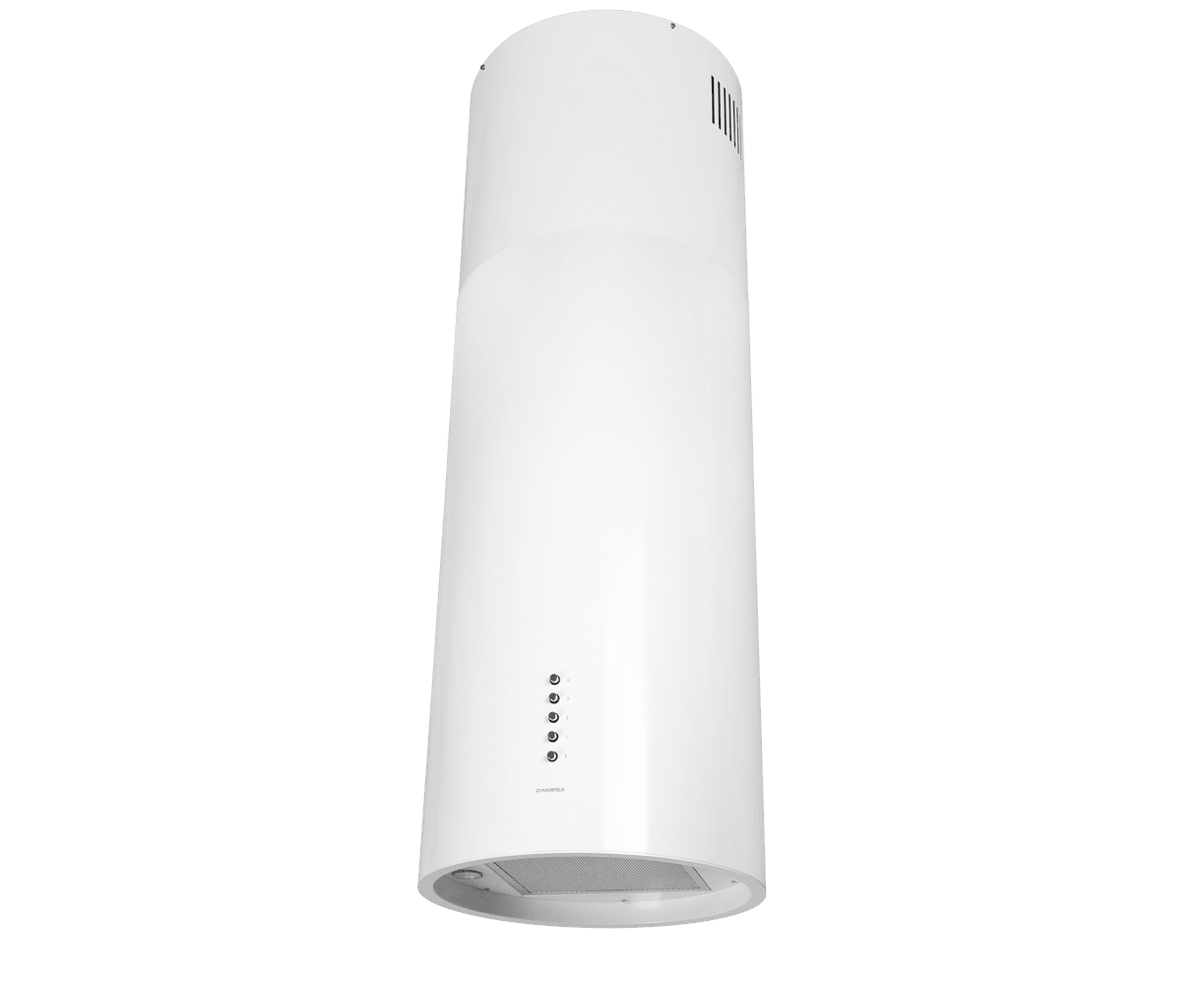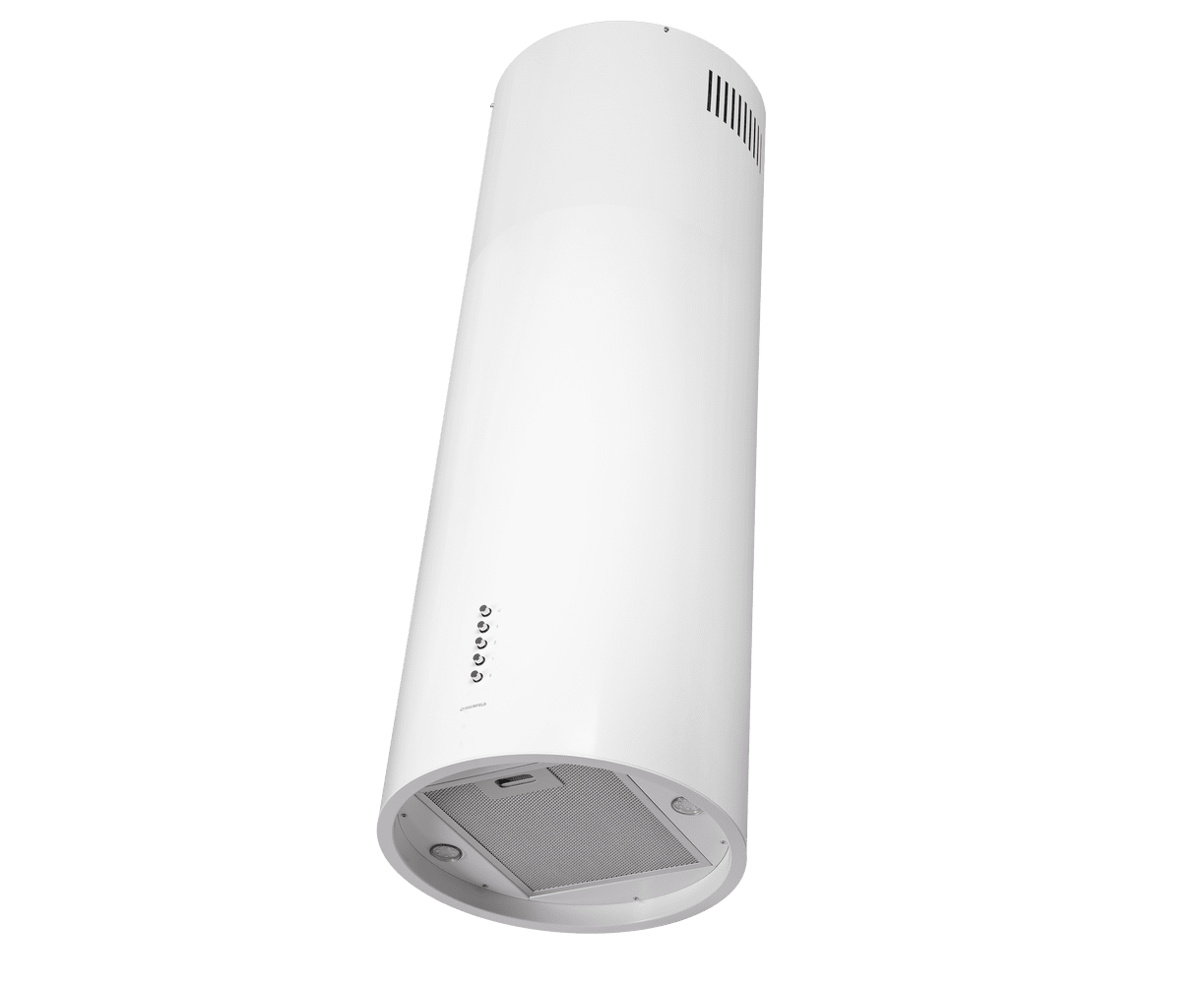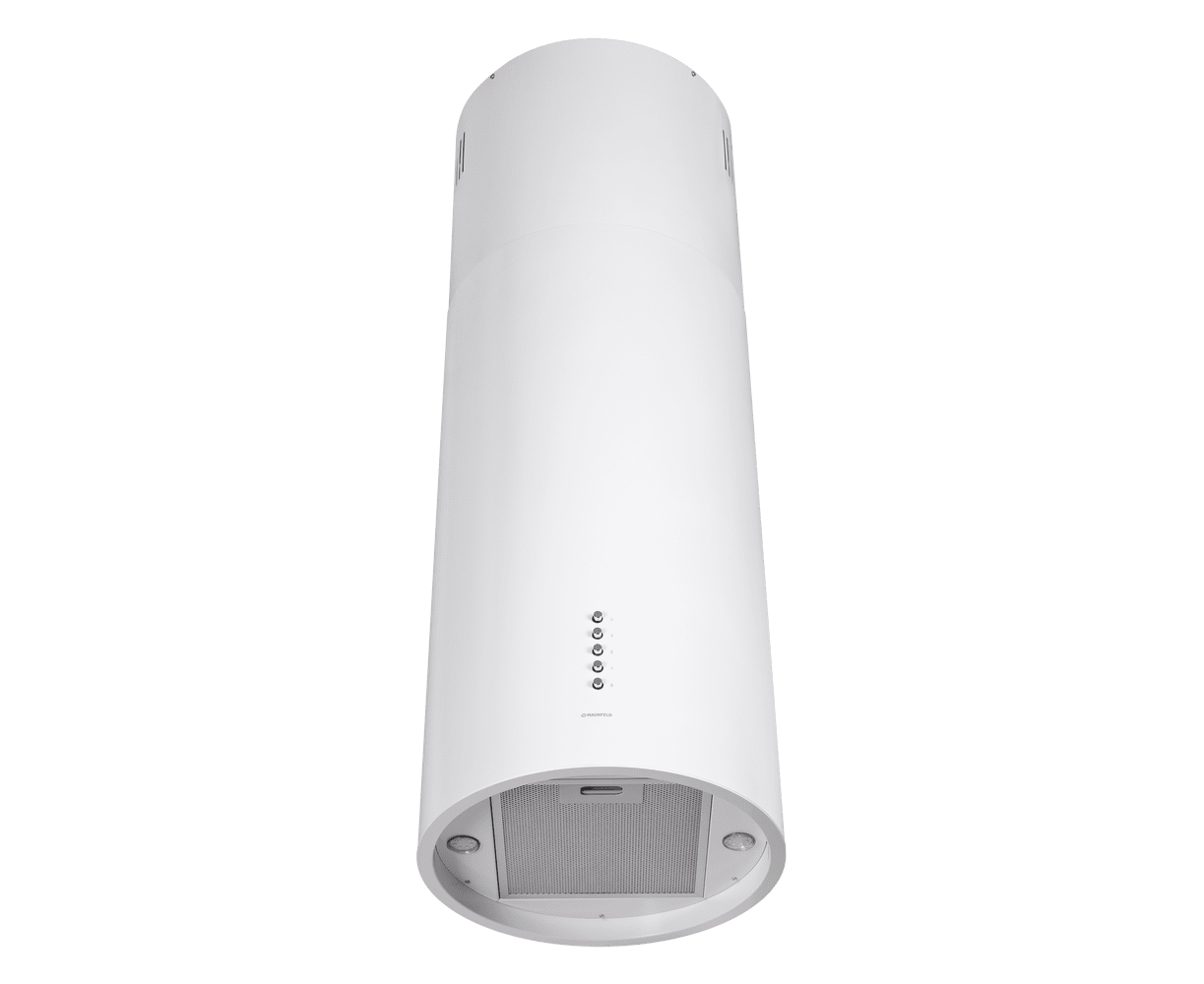 Корпус цилиндрической формы, выполненный из нержавеющей стали с термостойким покрытием белого цвета, монтируется на потолок над варочной поверхностью. В нижнем торце вытяжки расположен специальный многослойный жироулавливающий фильтр, который легко вынимается и полностью разбирается для чистки.