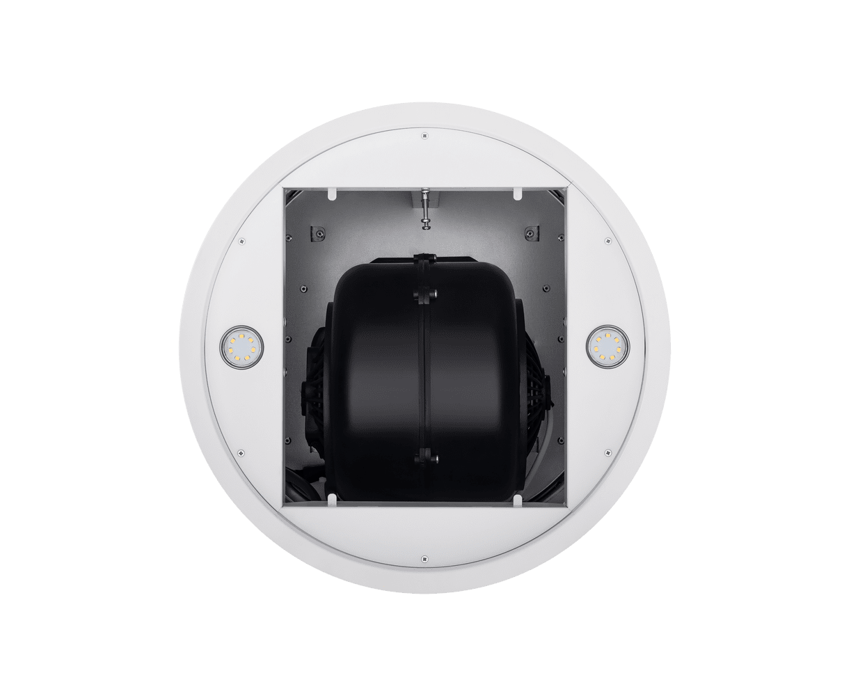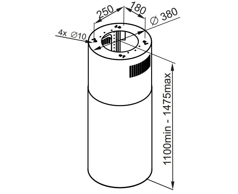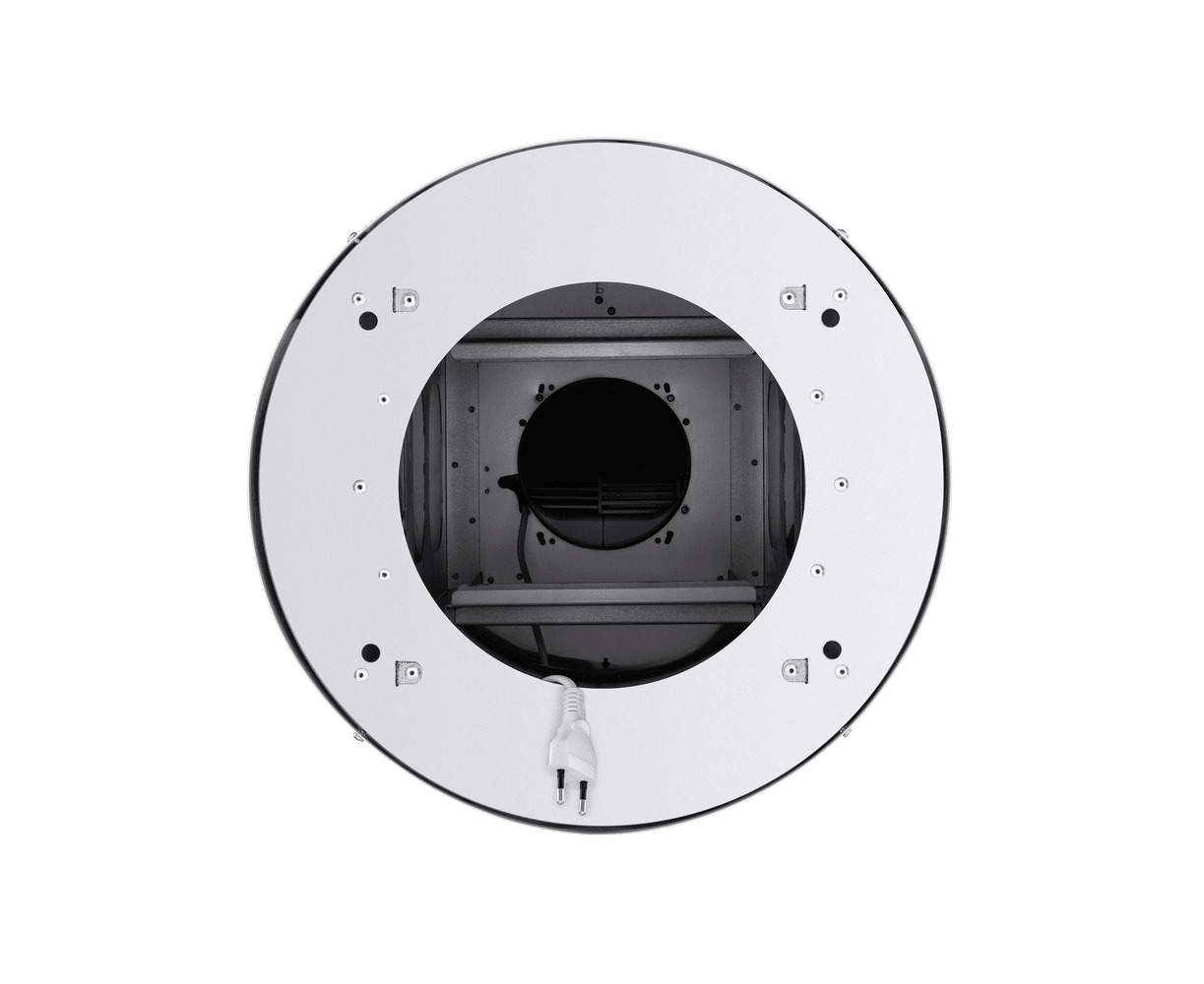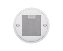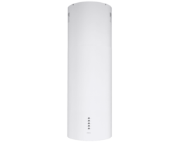 Корпус цилиндрической формы, выполненный из нержавеющей стали с термостойким покрытием белого цвета, монтируется на потолок над варочной поверхностью. В нижнем торце вытяжки расположен специальный многослойный жироулавливающий фильтр, который легко вынимается и полностью разбирается для чистки.