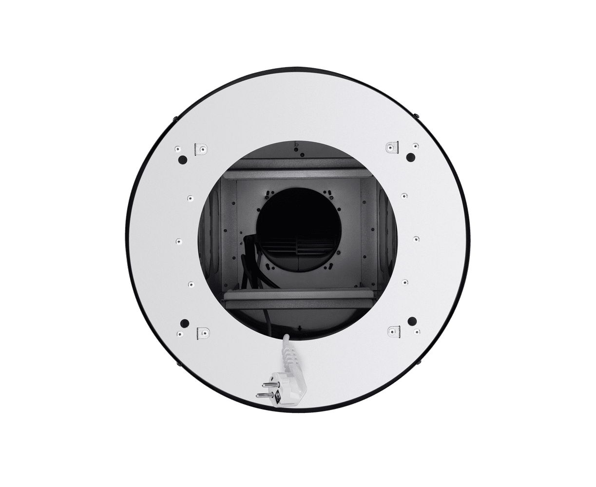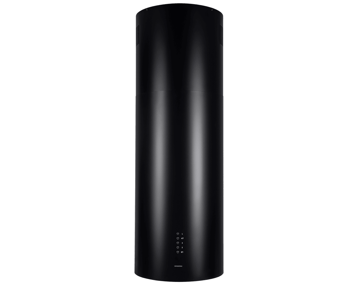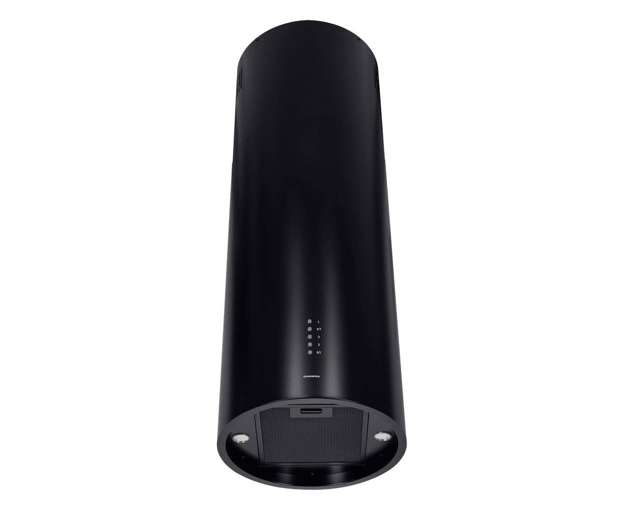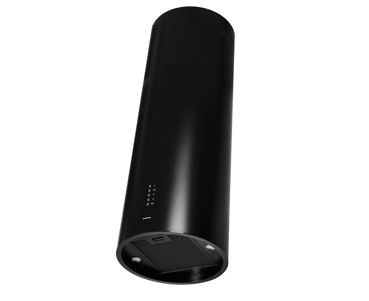 Корпус цилиндрической формы, выполненный из нержавеющей стали с термостойким покрытием черного цвета, крепится на потолок над поверхностью плиты. В нижней части вытяжки находится алюминиевый многослойный жироулавливающий фильтр. Он легко вынимается и полностью разбирается, что сильно упрощает чистку.