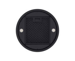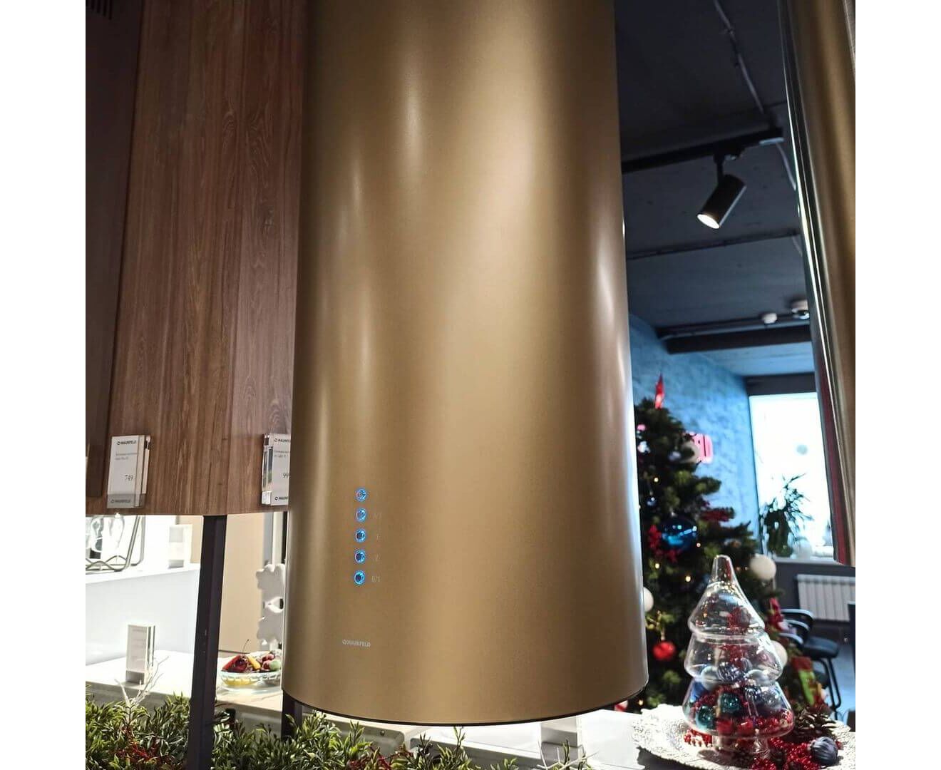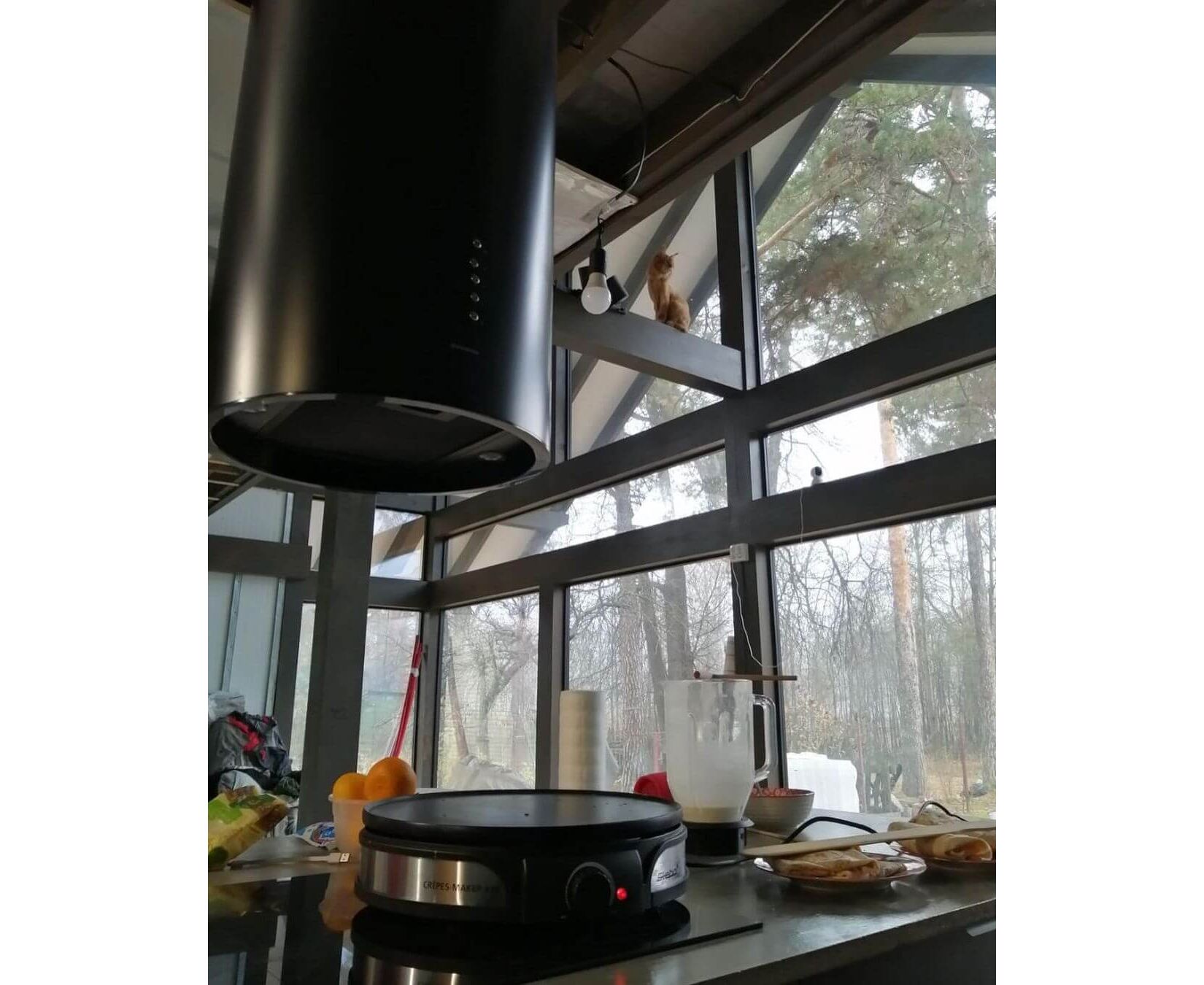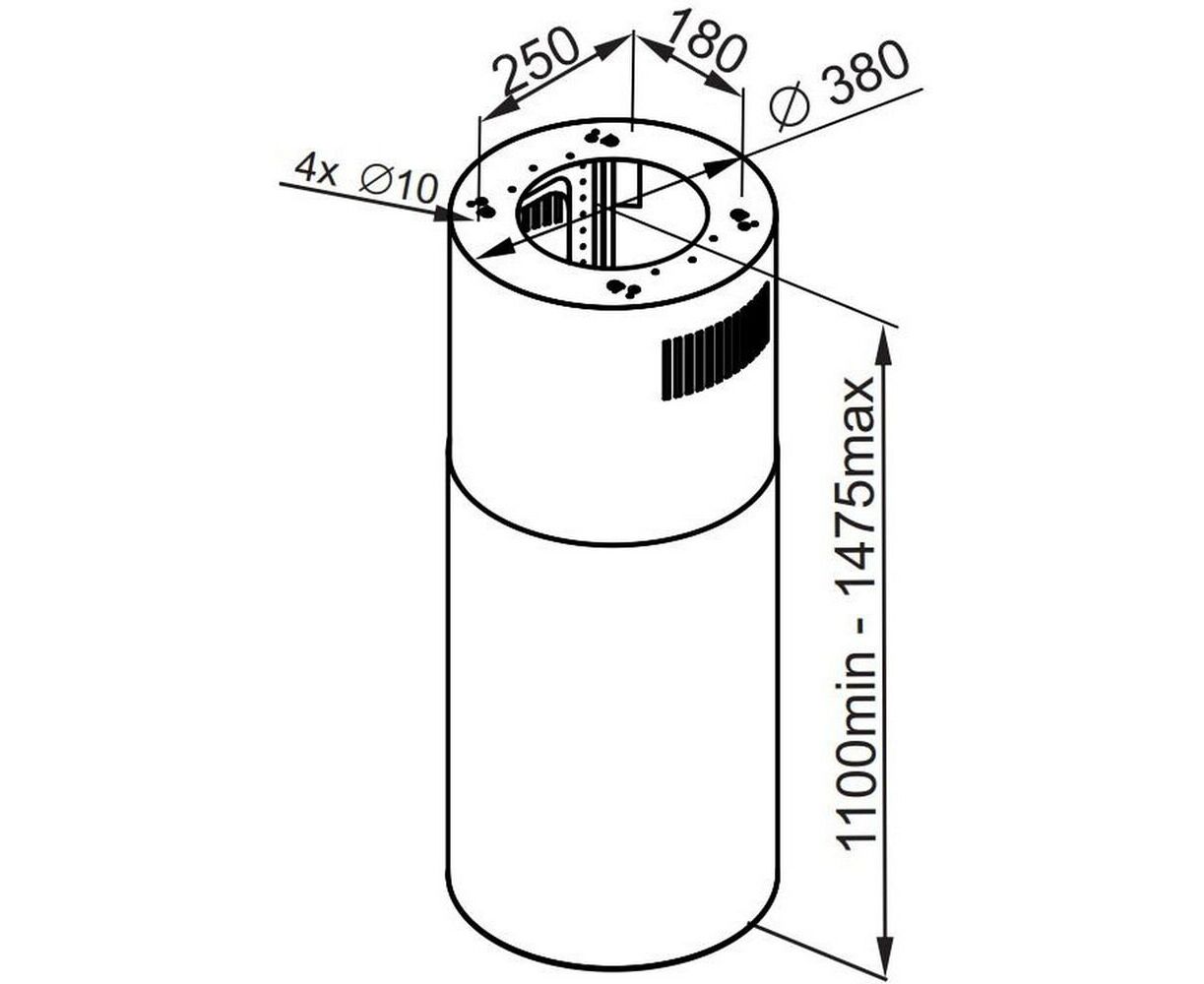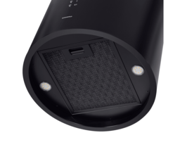 Корпус цилиндрической формы, выполненный из нержавеющей стали с термостойким покрытием черного цвета, крепится на потолок над поверхностью плиты. В нижней части вытяжки находится алюминиевый многослойный жироулавливающий фильтр. Он легко вынимается и полностью разбирается, что сильно упрощает чистку.