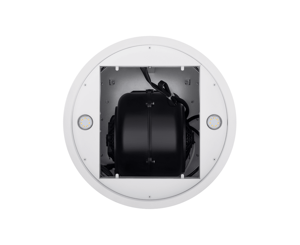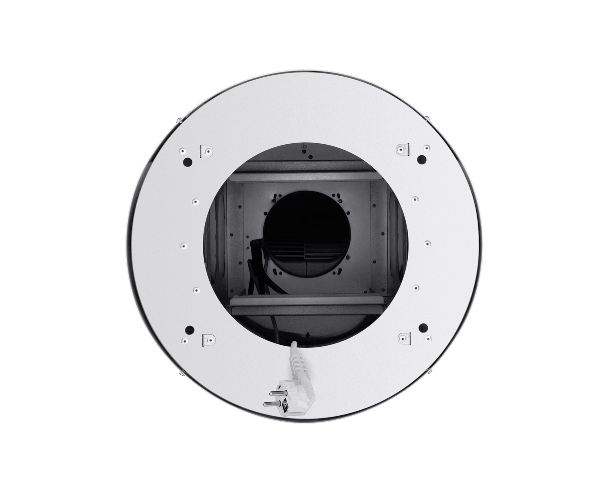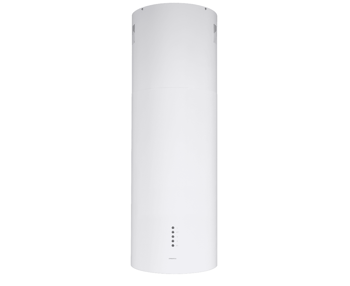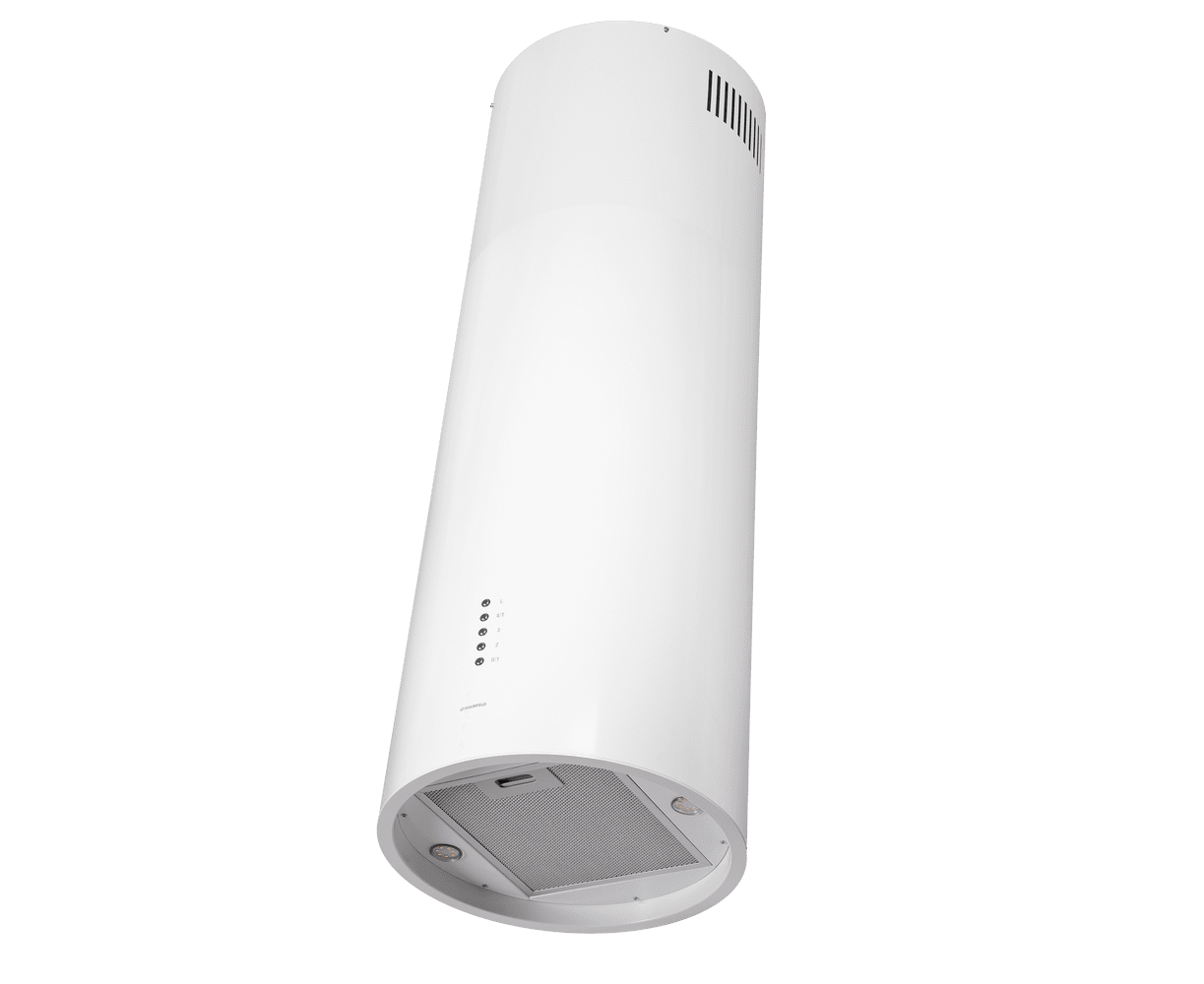 Корпус цилиндрической формы, выполненный из нержавеющей стали с термостойким покрытием белого цвета, крепится на потолок над поверхностью плиты. В нижней части вытяжки находится алюминиевый многослойный жироулавливающий фильтр. Он легко вынимается и полностью разбирается, что сильно упрощает чистку.