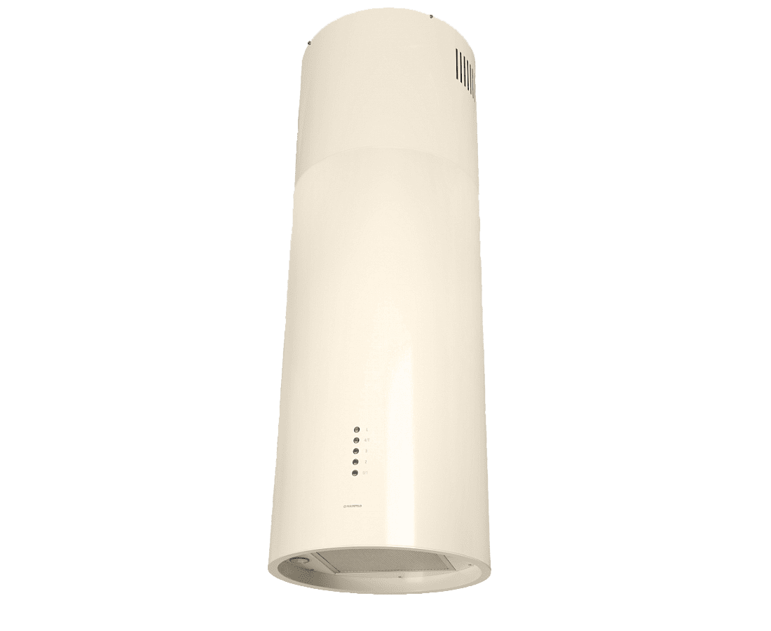 Корпус цилиндрической формы, выполненный из нержавеющей стали с термостойким покрытием бежевого цвета, крепится на потолок над поверхностью плиты. В нижней части вытяжки находится алюминиевый многослойный жироулавливающий фильтр. Он легко вынимается и полностью разбирается, что сильно упрощает чистку.