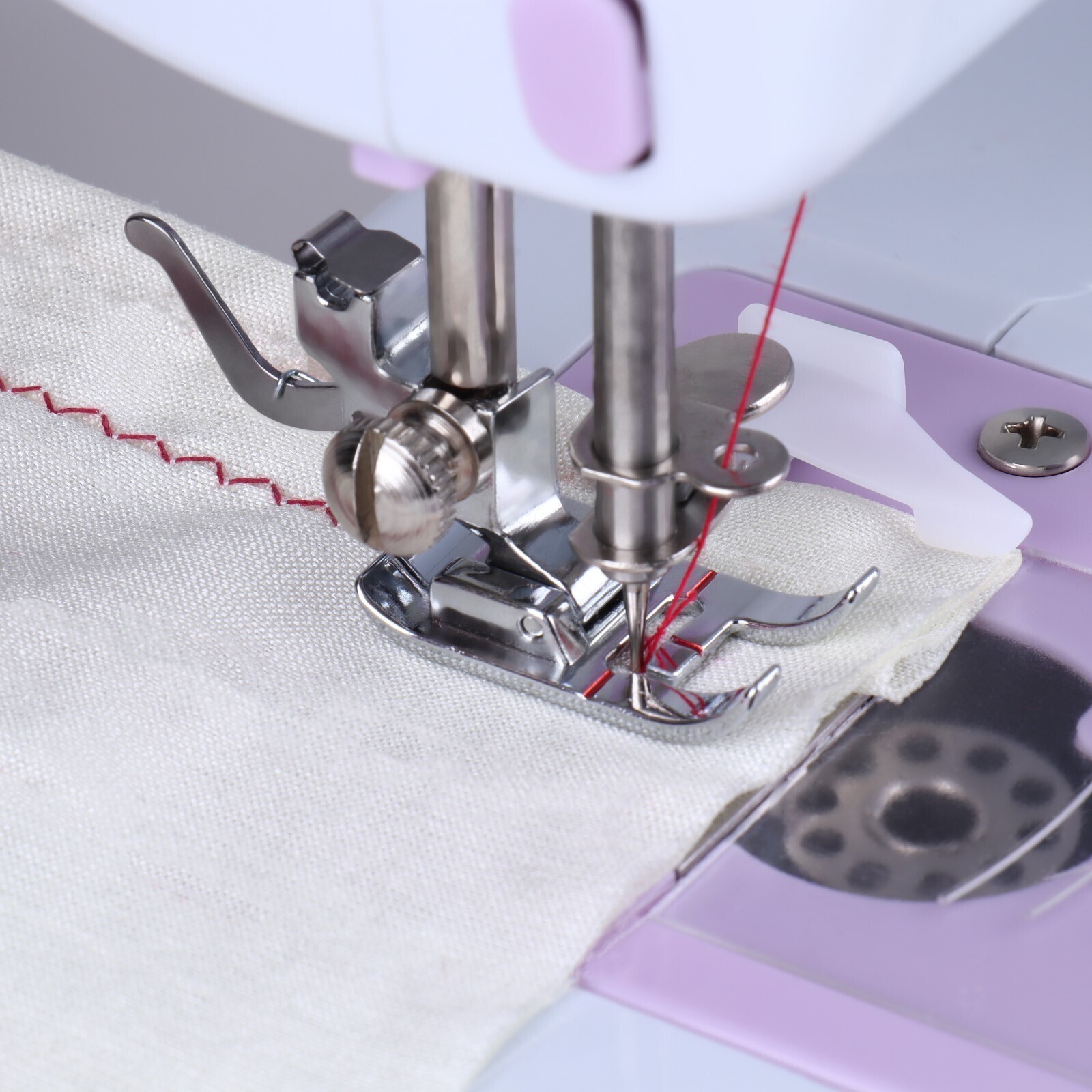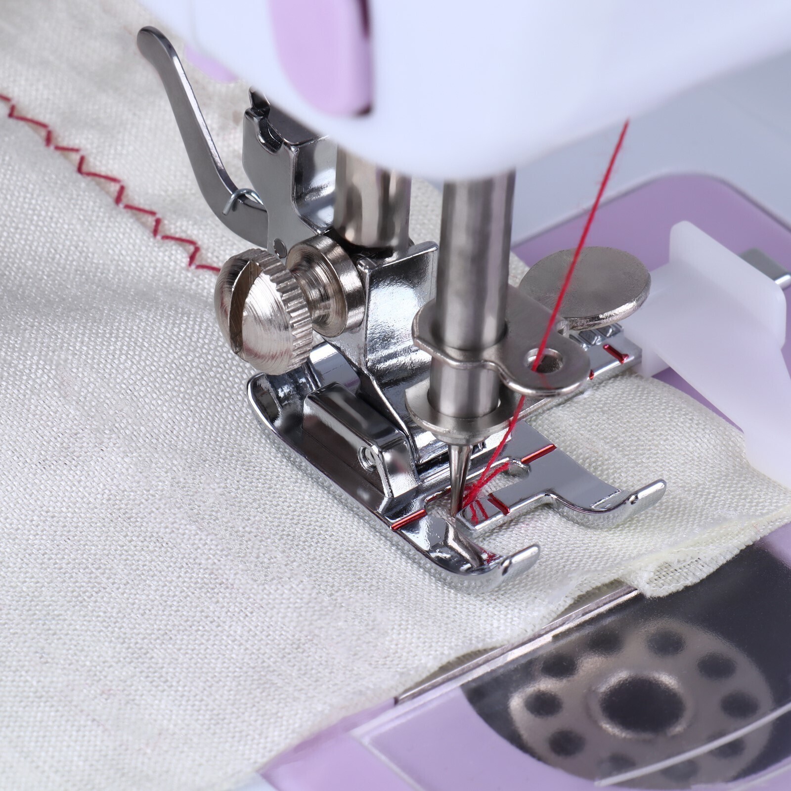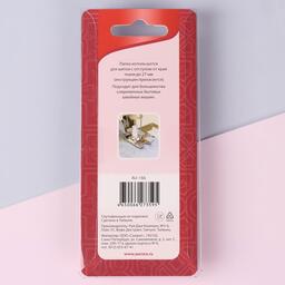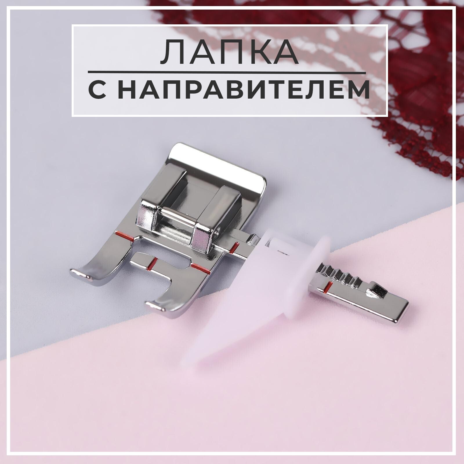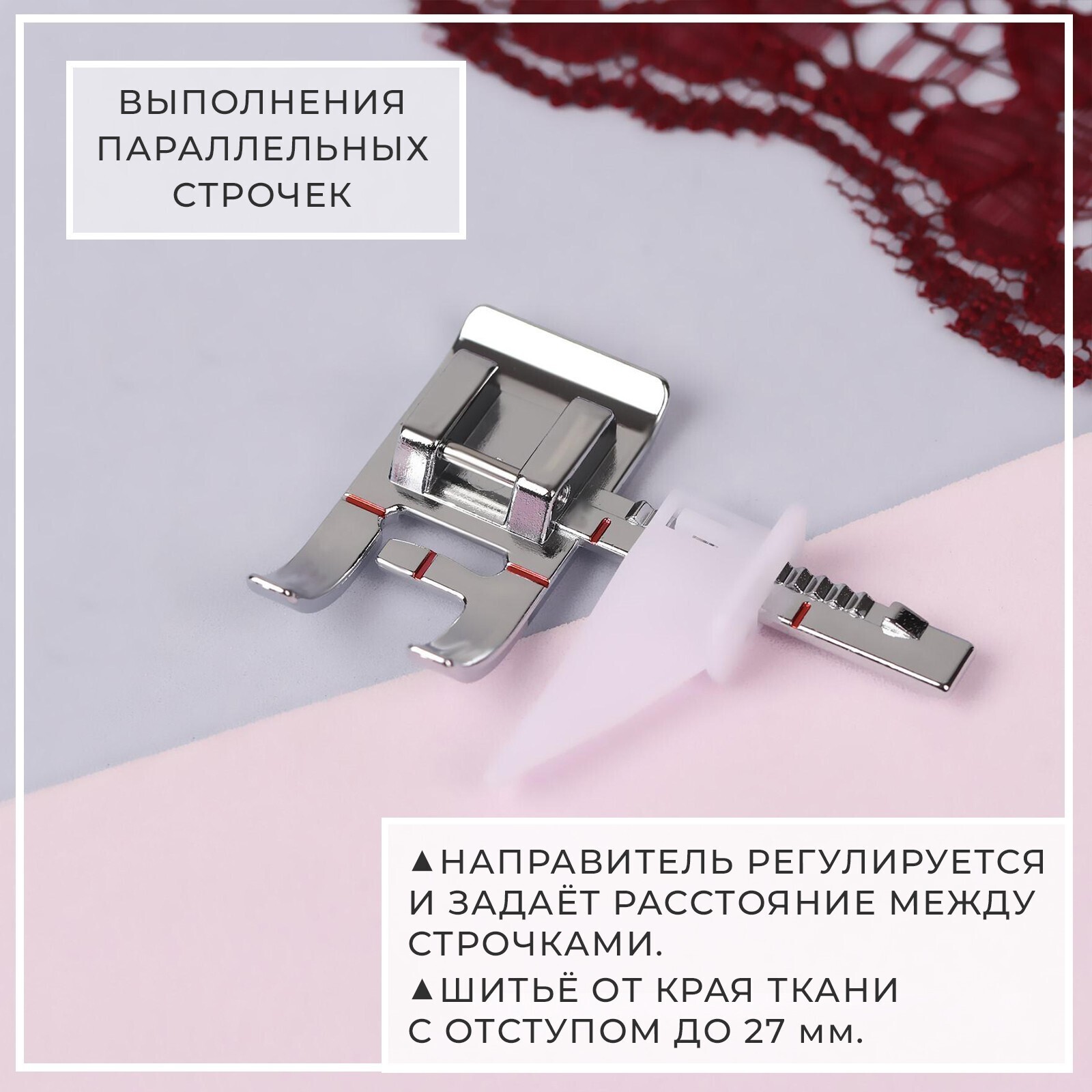 Лапка с линейкой предназначена для выполнения параллельных строчек. Направитель регулируется и задаёт расстояние между строчками. Максимальный отступ от края ткани — 27 мм.