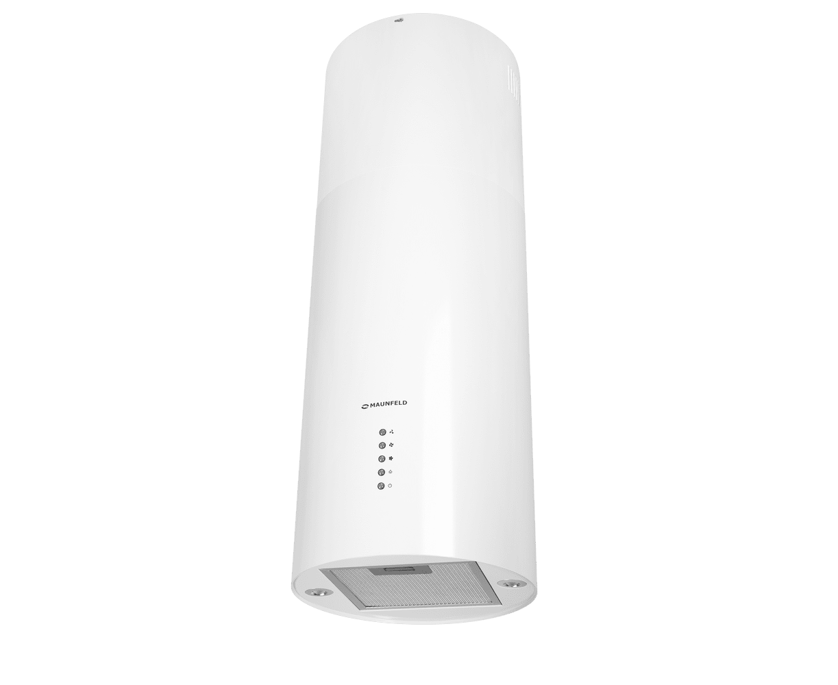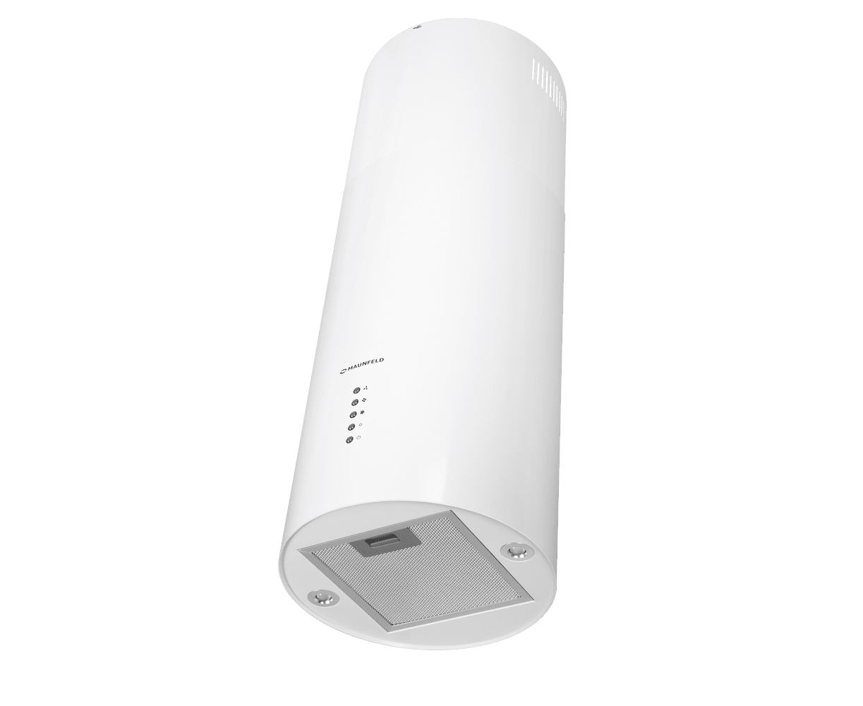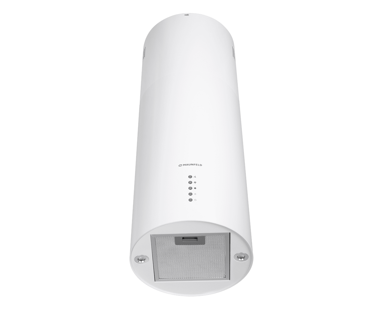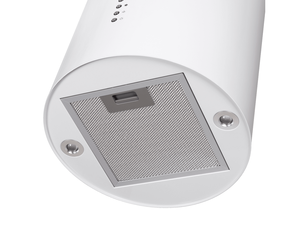 Корпус цилиндрической формы, выполненный из нержавеющей стали с термостойким покрытием белого цвета, крепится на потолок над поверхностью плиты. Алюминиевый многослойный жироулавливающий фильтр находится в нижней части вытяжки.
