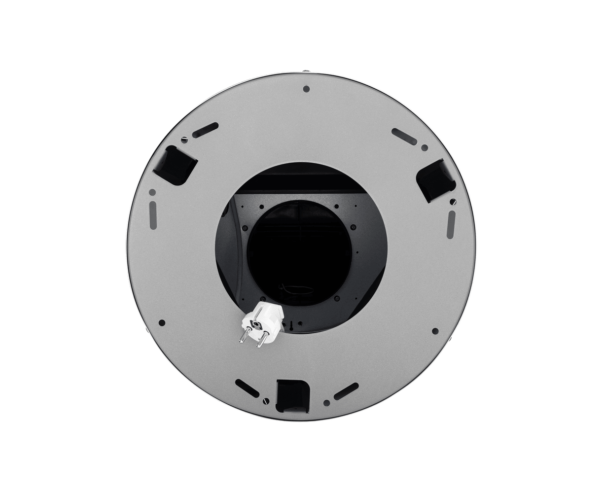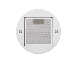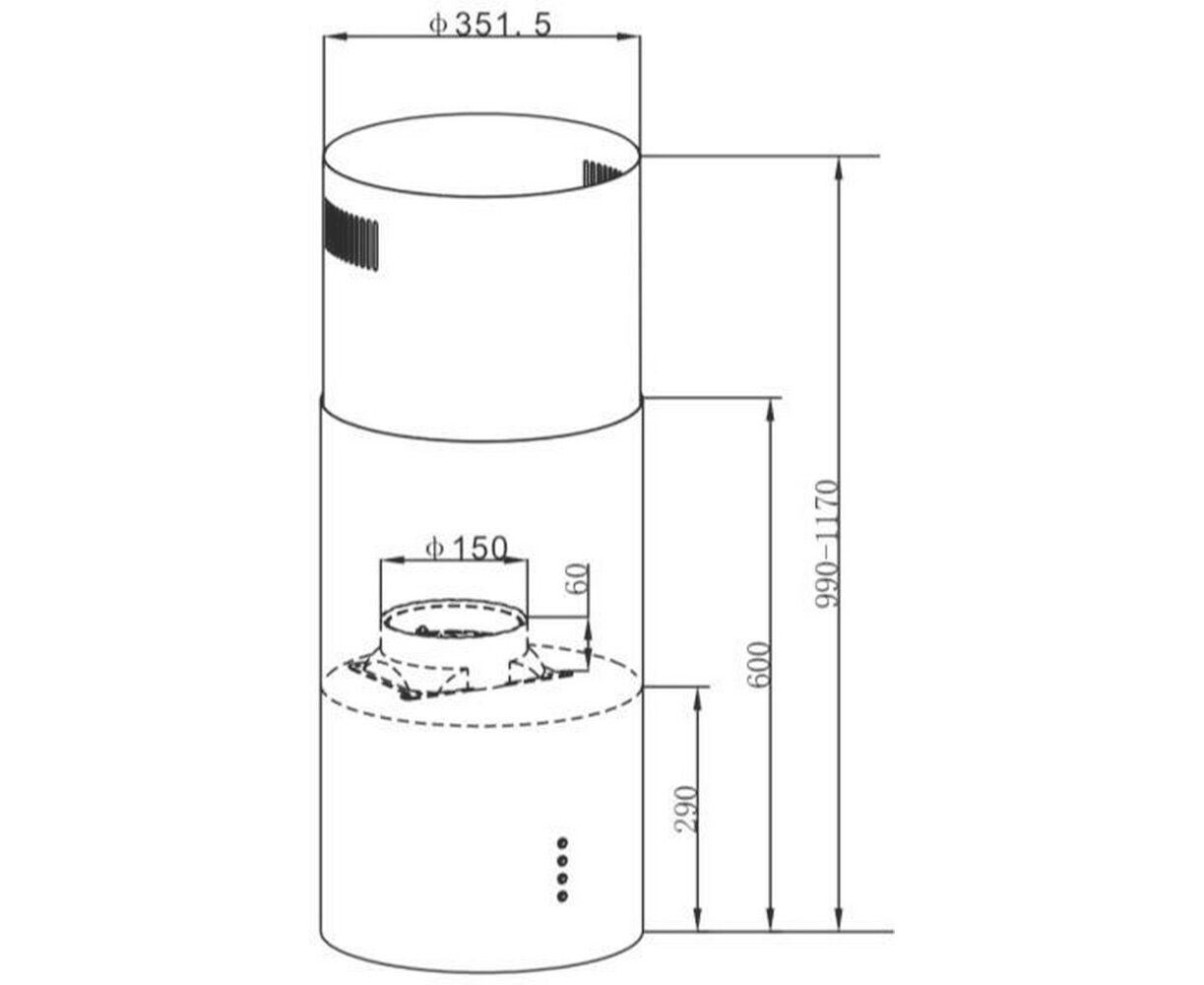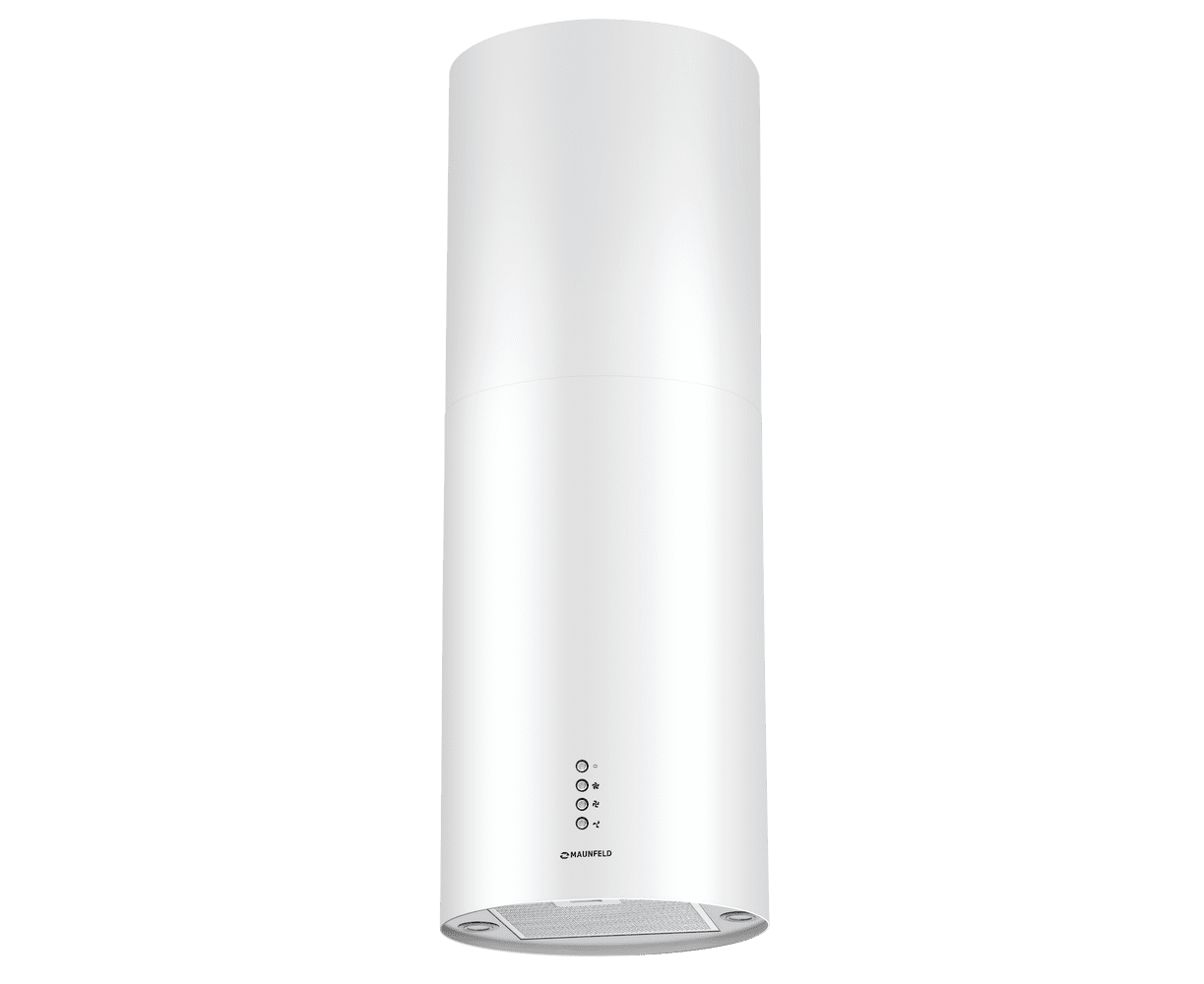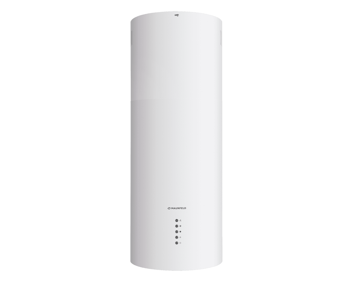 Корпус цилиндрической формы, выполненный из нержавеющей стали с термостойким покрытием белого цвета, крепится на потолок над поверхностью плиты. Алюминиевый многослойный жироулавливающий фильтр находится в нижней части вытяжки.