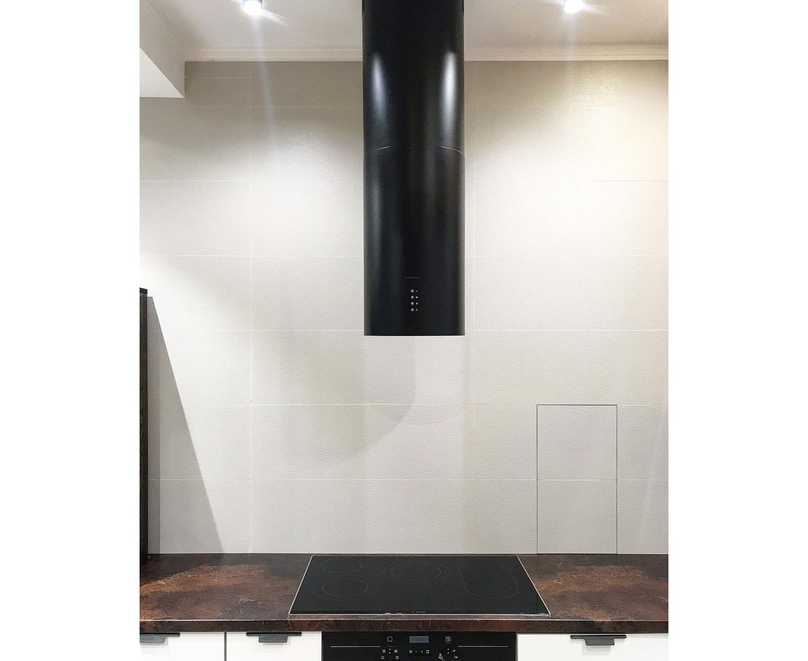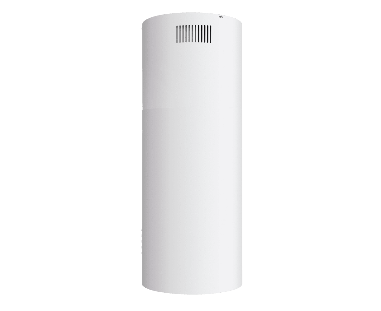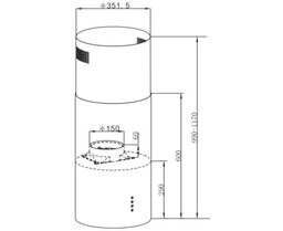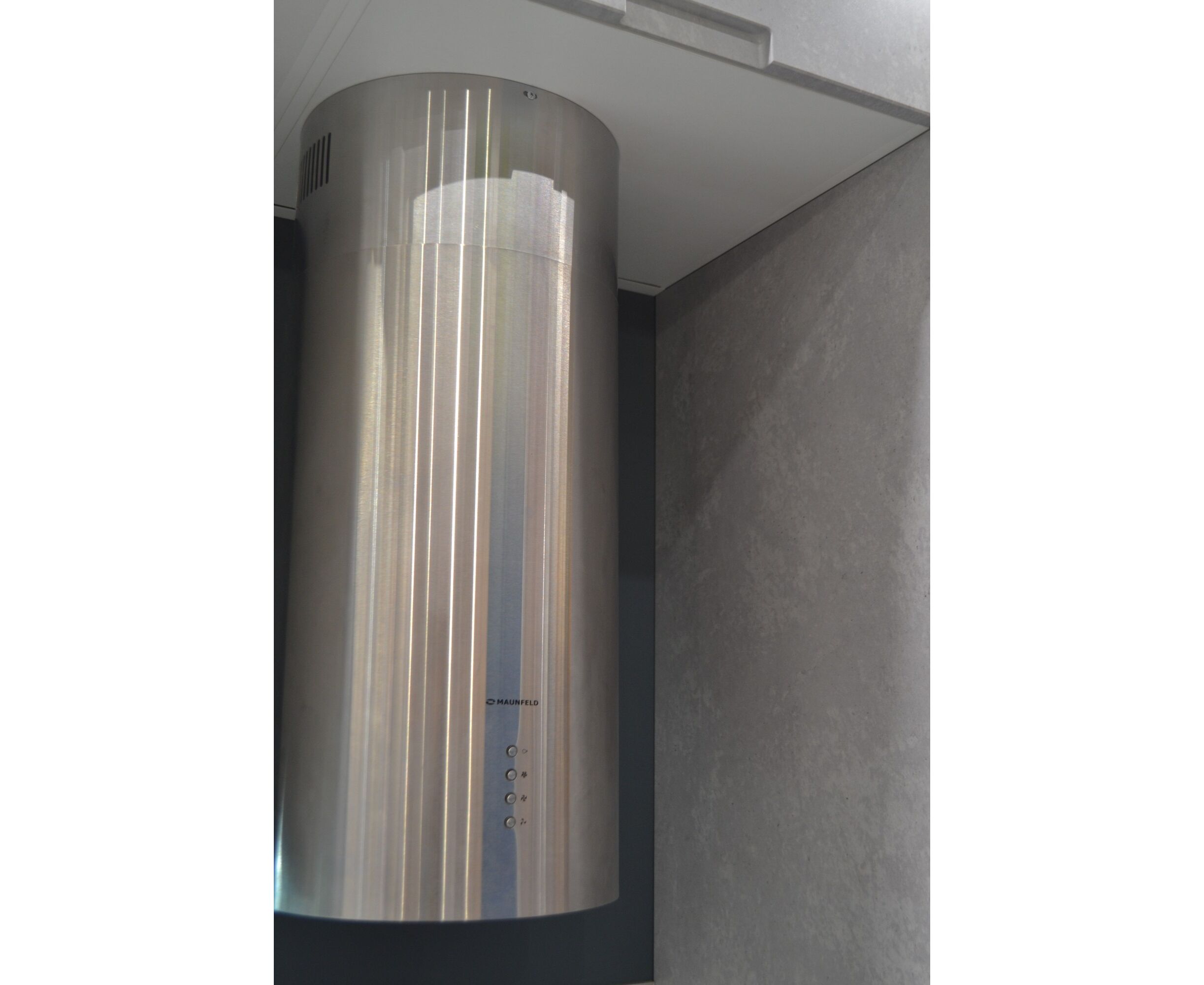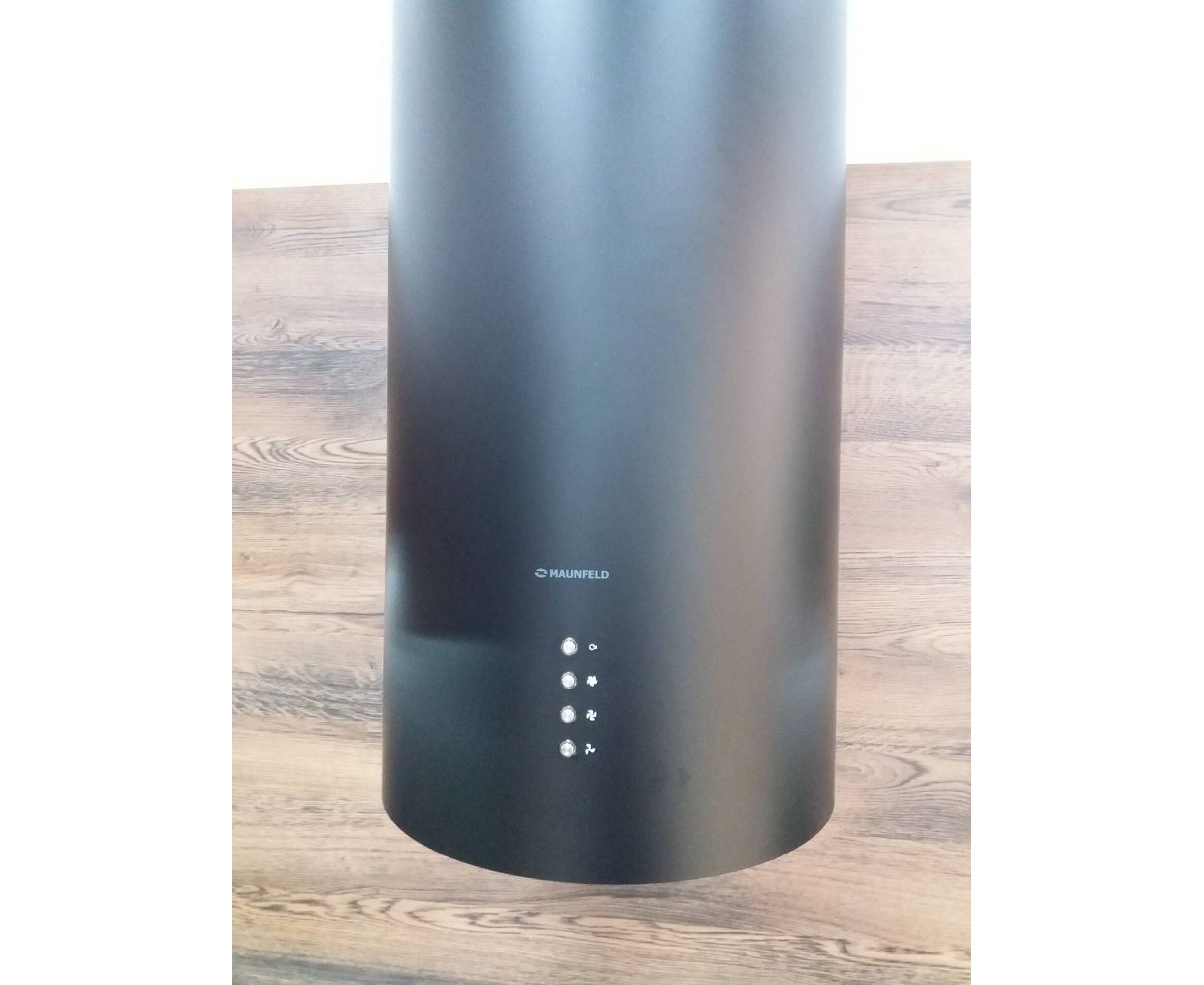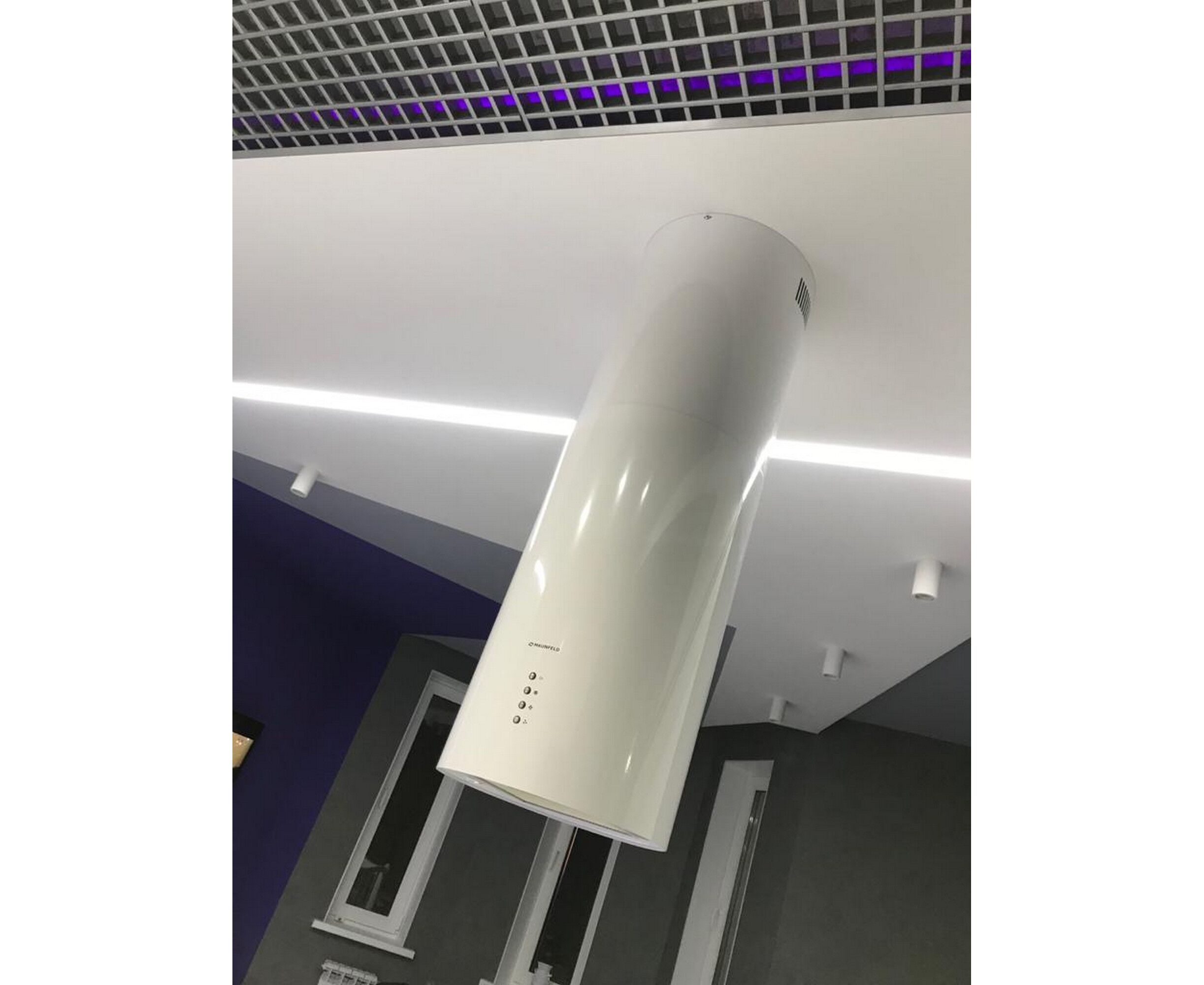 Корпус цилиндрической формы, выполненный из нержавеющей стали с термостойким покрытием белого цвета, крепится на потолок над поверхностью плиты. Алюминиевый многослойный жироулавливающий фильтр находится в нижней части вытяжки.