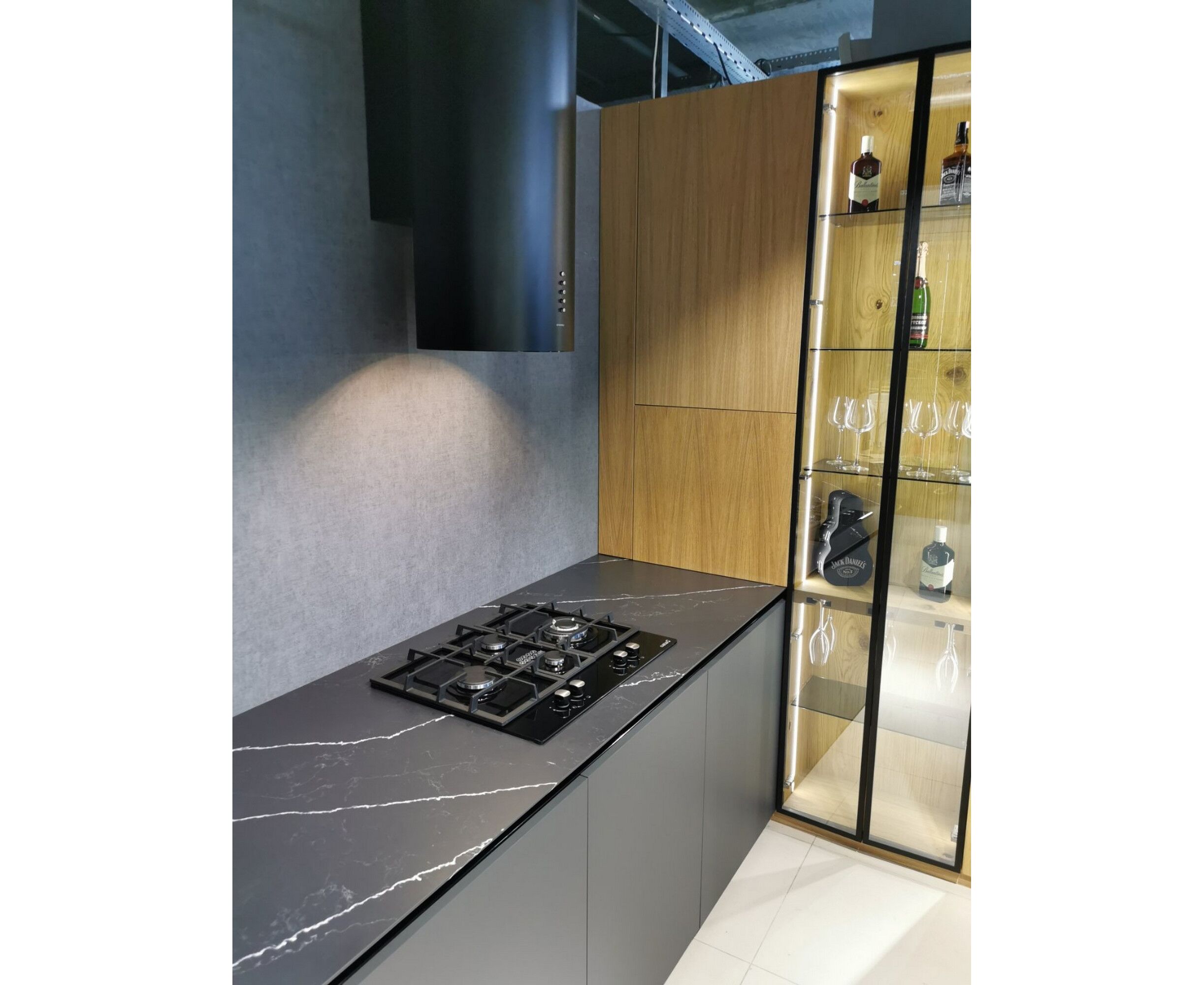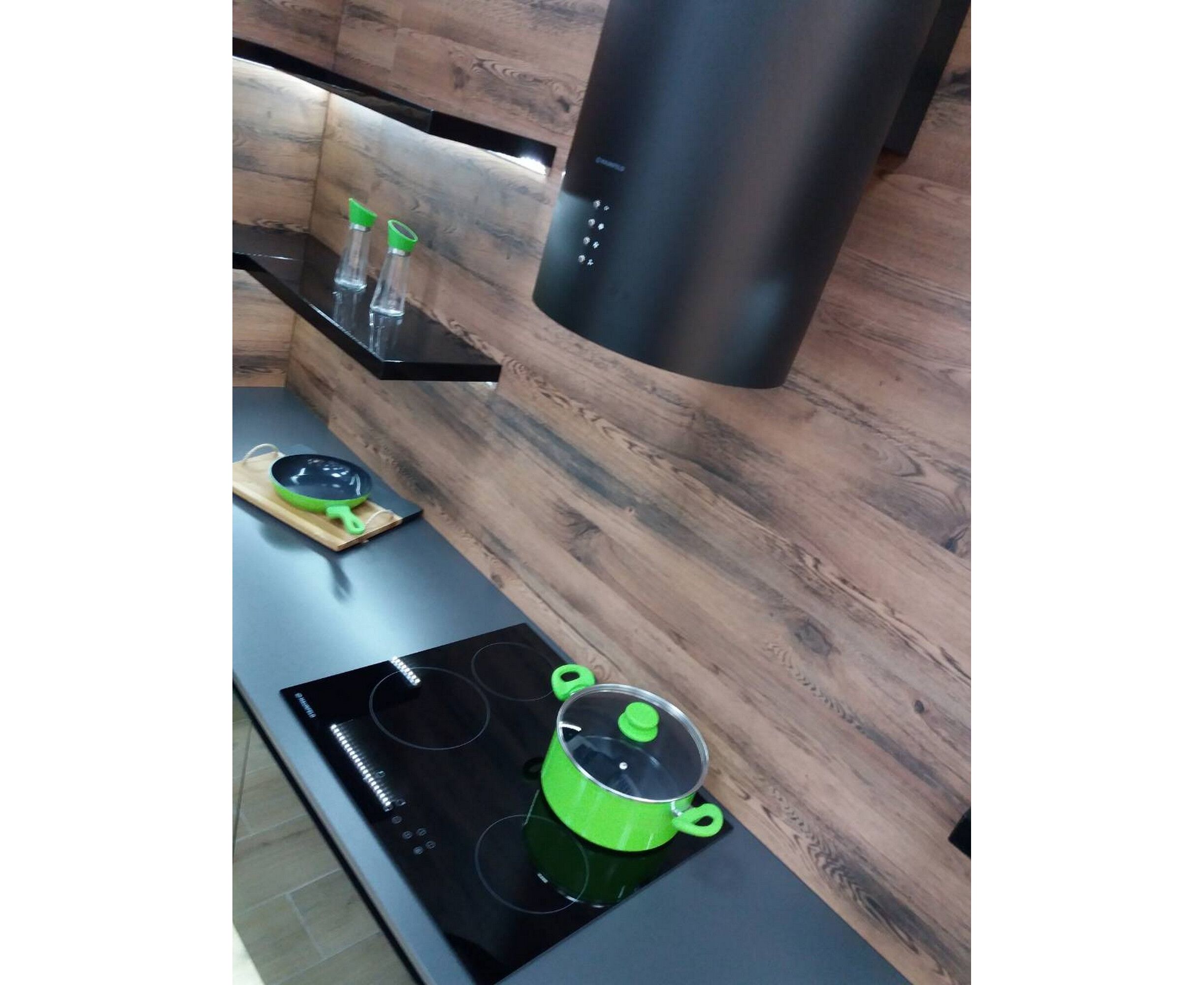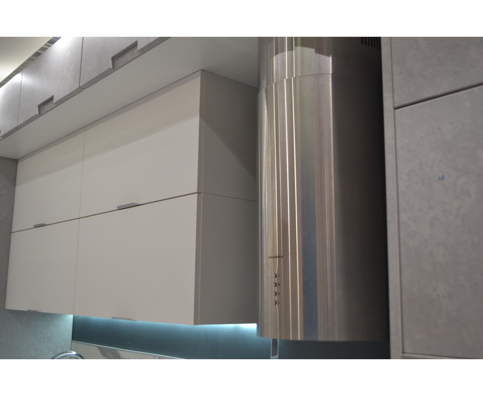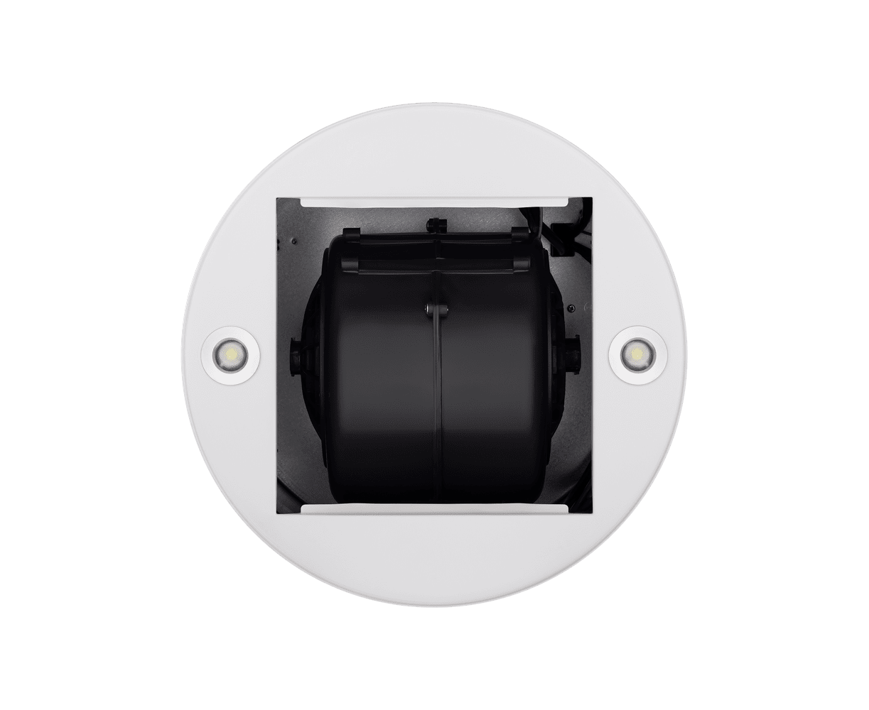 Корпус цилиндрической формы, выполненный из нержавеющей стали с термостойким покрытием белого цвета, крепится на потолок над поверхностью плиты. Алюминиевый многослойный жироулавливающий фильтр находится в нижней части вытяжки.