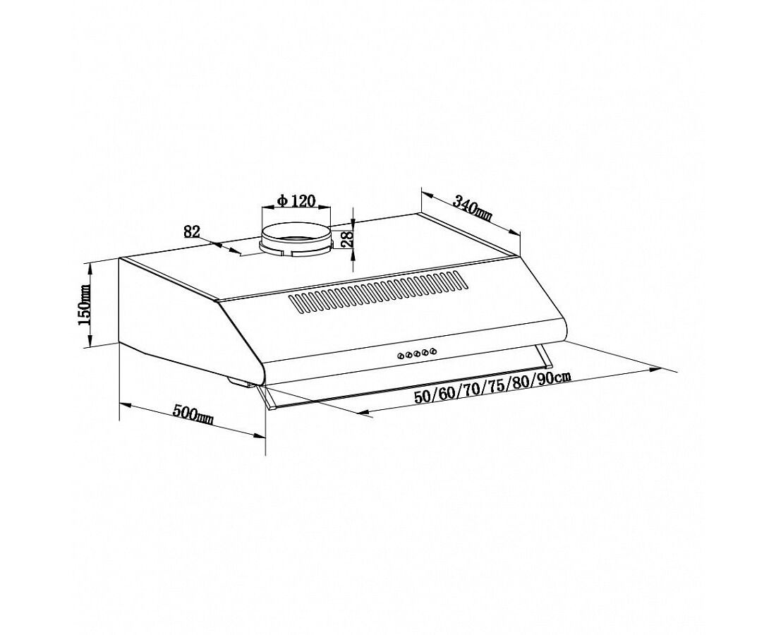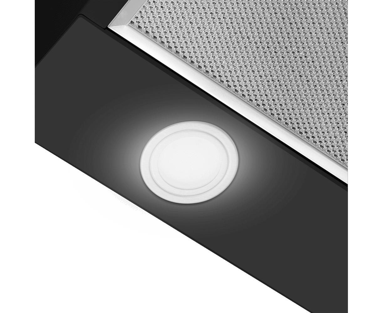Кнопочное управление, расположенное на торце вытяжки, позволяет выбрать одну из 3-х скоростей работы вентилятора и включить освещение (две LED-лампы по 1 Вт каждая).