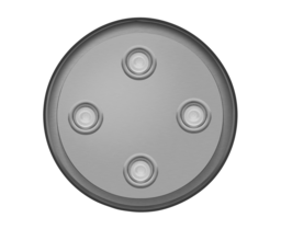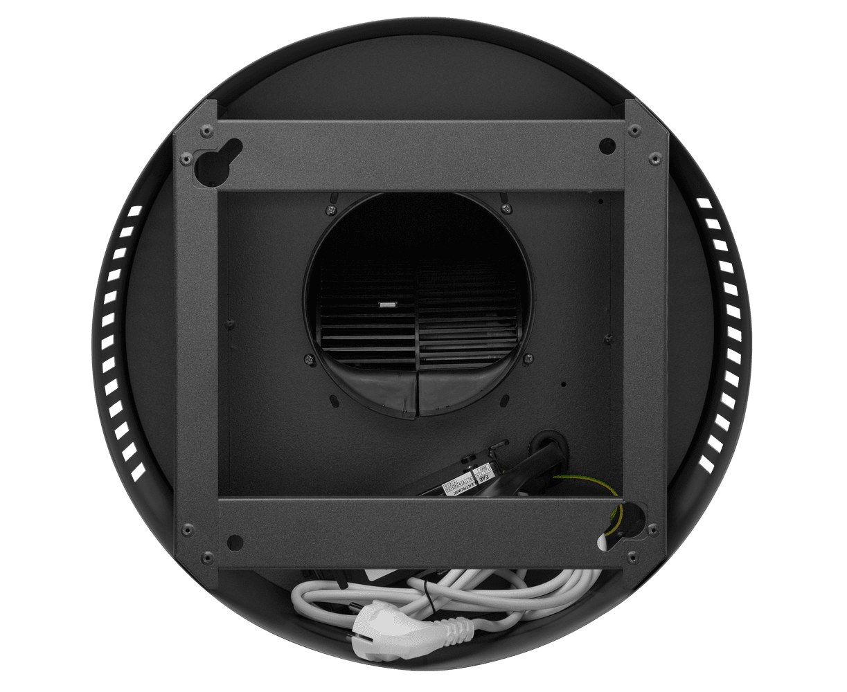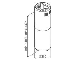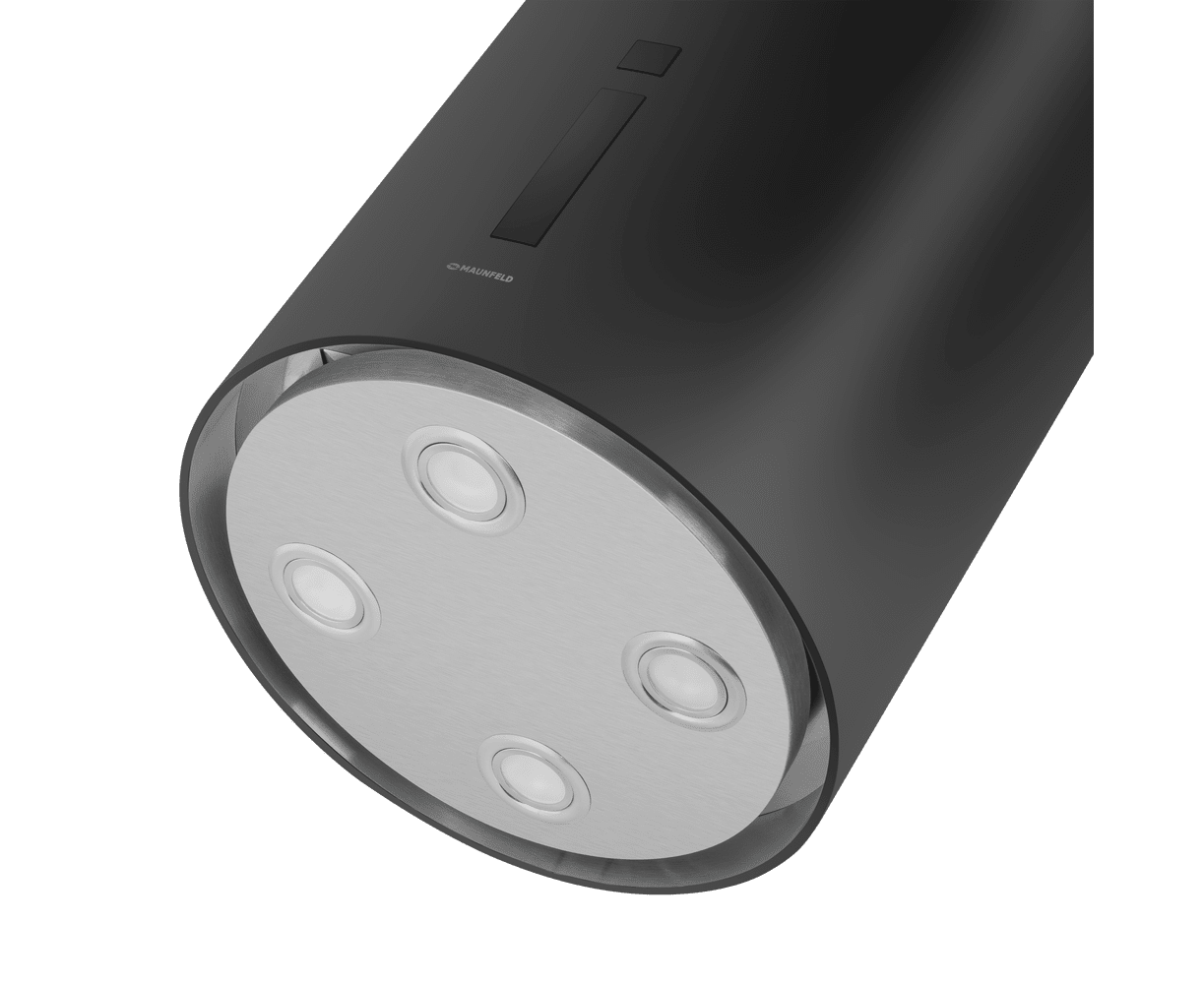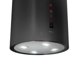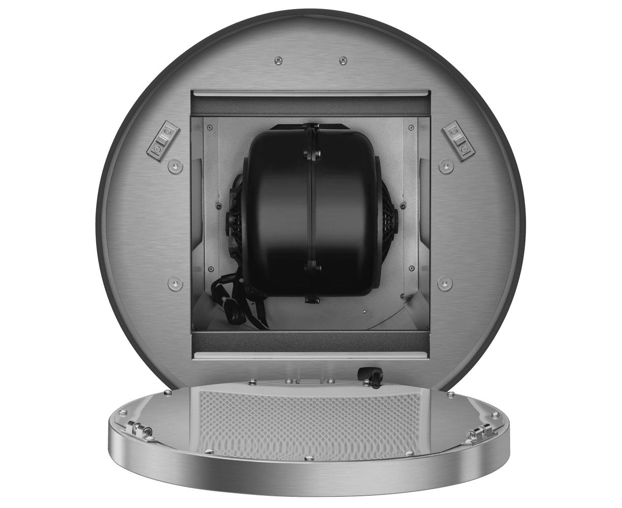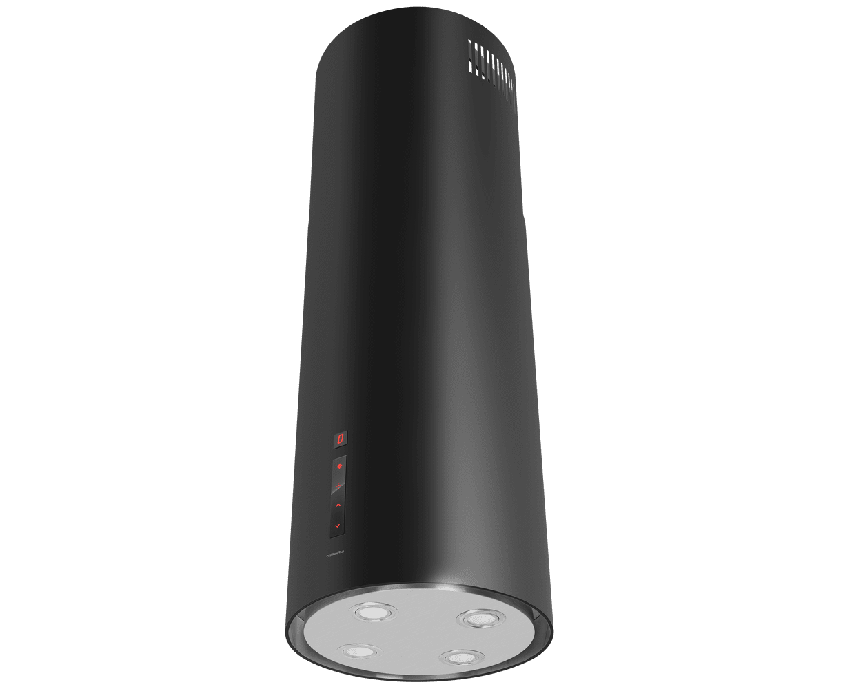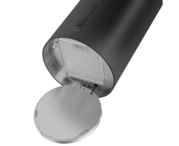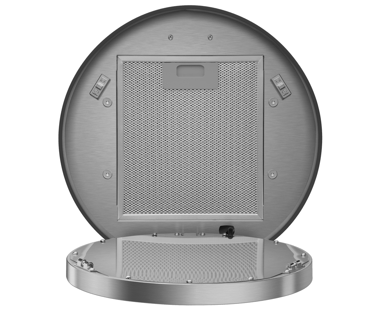 Корпус цилиндрической формы, выполненный из нержавеющей стали, крепится на потолок над поверхностью плиты. В нижней части вытяжки находится алюминиевый многослойный жироулавливающий фильтр. Он легко вынимается и полностью разбирается, что сильно упрощает чистку.
