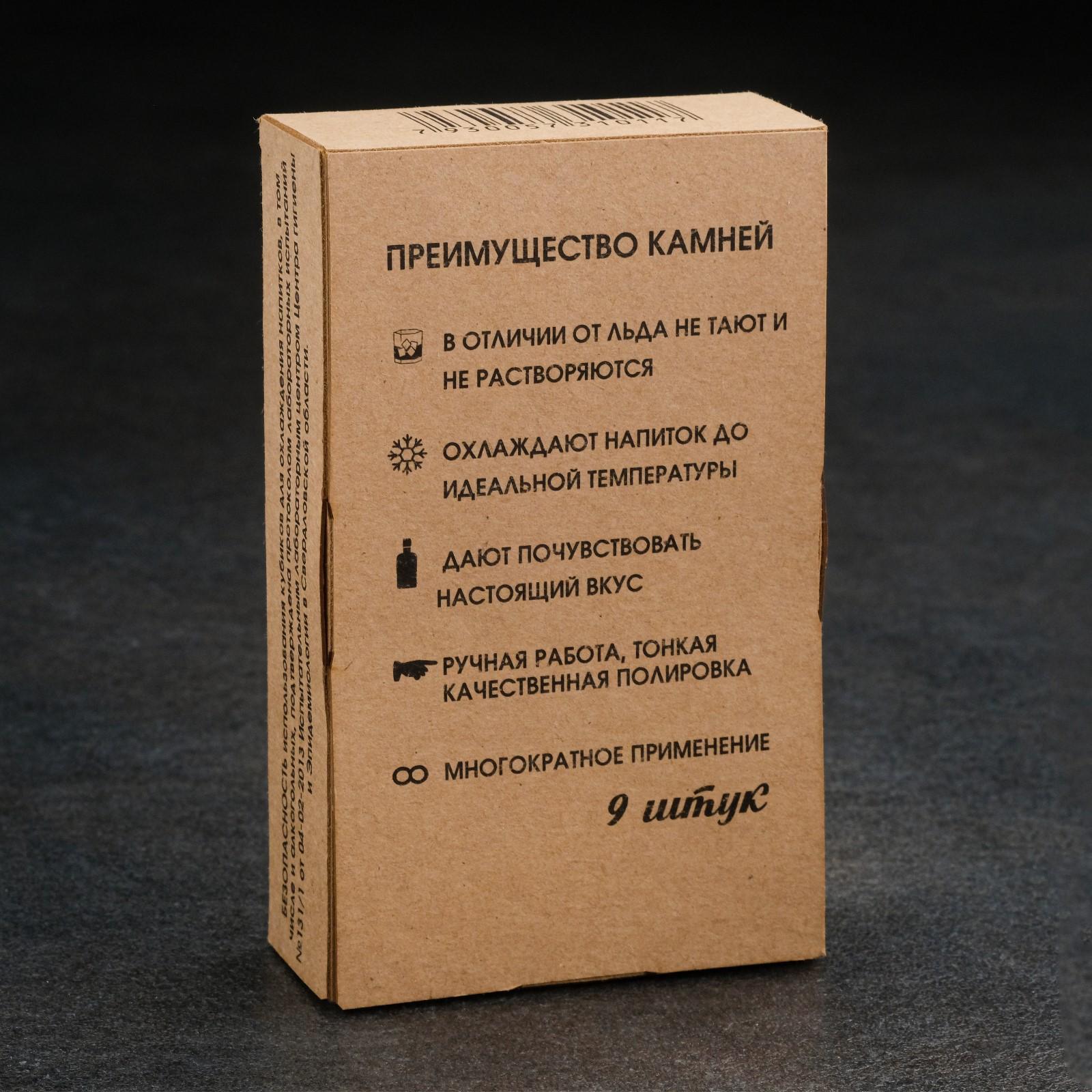 Камни полностью упакованы: подарочная упаковка, мешочек, в комплекте 9 камней. Рекомендуется предупредить друга о необходимости заблаговременно купить виски и, как вариант, открыть вам доступ к морозильной камере. Можно захватить с собой упаковку хорошего кофе: камни работают и «в обратную сторону»: если в чашку добавить горячие камни, утром кофе долго не будет остывать.