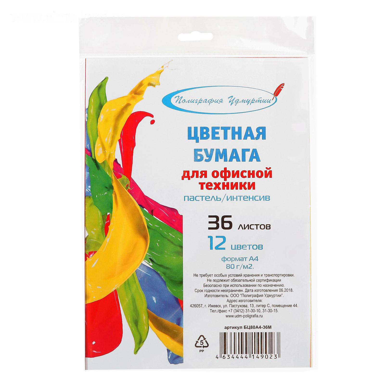 Бумага цветная А4, 36 листов, 12 цветов "Для офисной техники", 80 г/м²