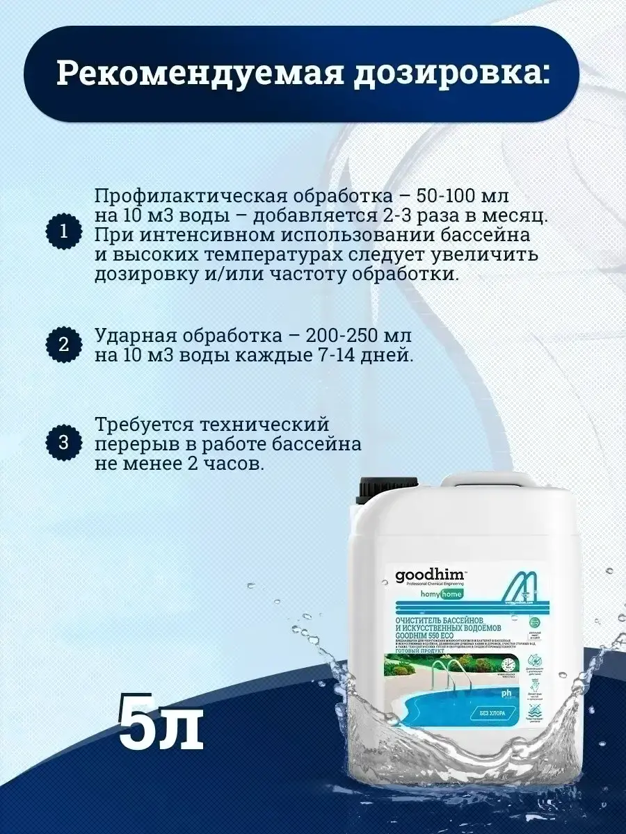 • Расход жидкости (на 1000 л воды) от 5 до 10 мл