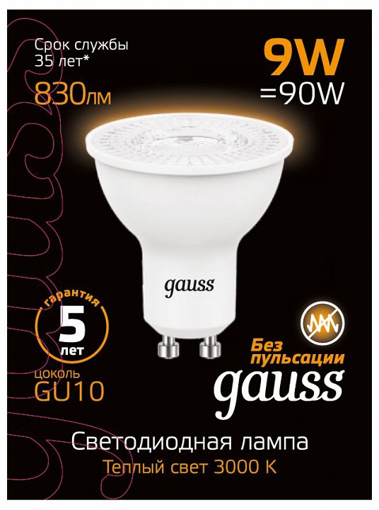 Лампа светодиодная Gauss SMD GU10 9Вт 3000K 101506109