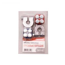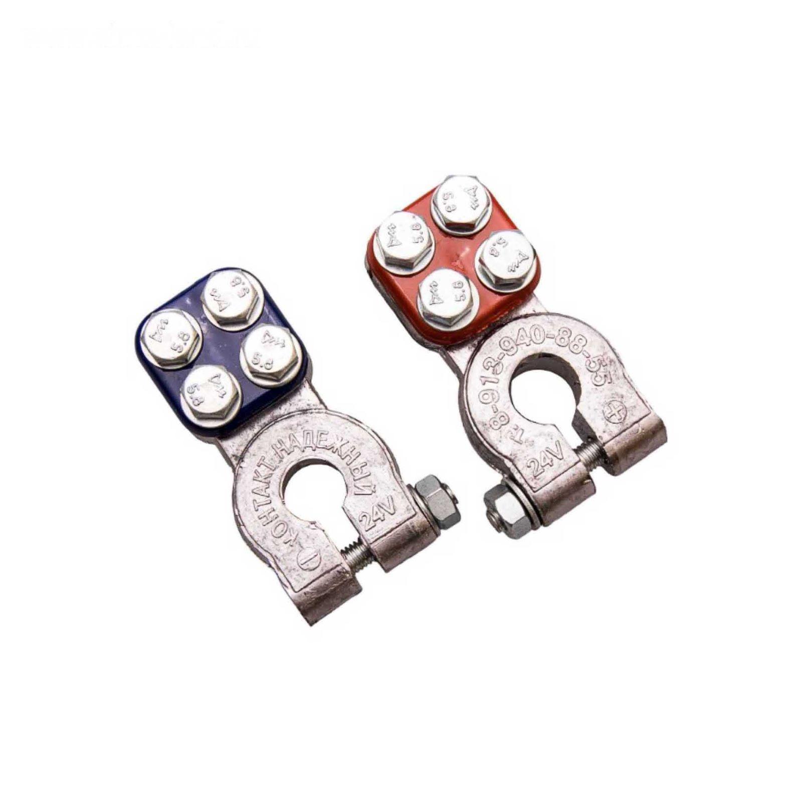 Набор больших грузовых клемм «+» и «-» используется для аккумуляторных батарей авто. Крепление провода осуществляется при помощи 4х болтов. Клемма изготовлена из свинца и выполняет работу не только крепления проводов, но и в некотором роде «проводника» и предохранителя. Свинцовая клемма обладает достаточной электропроводимостью и пластичностью.