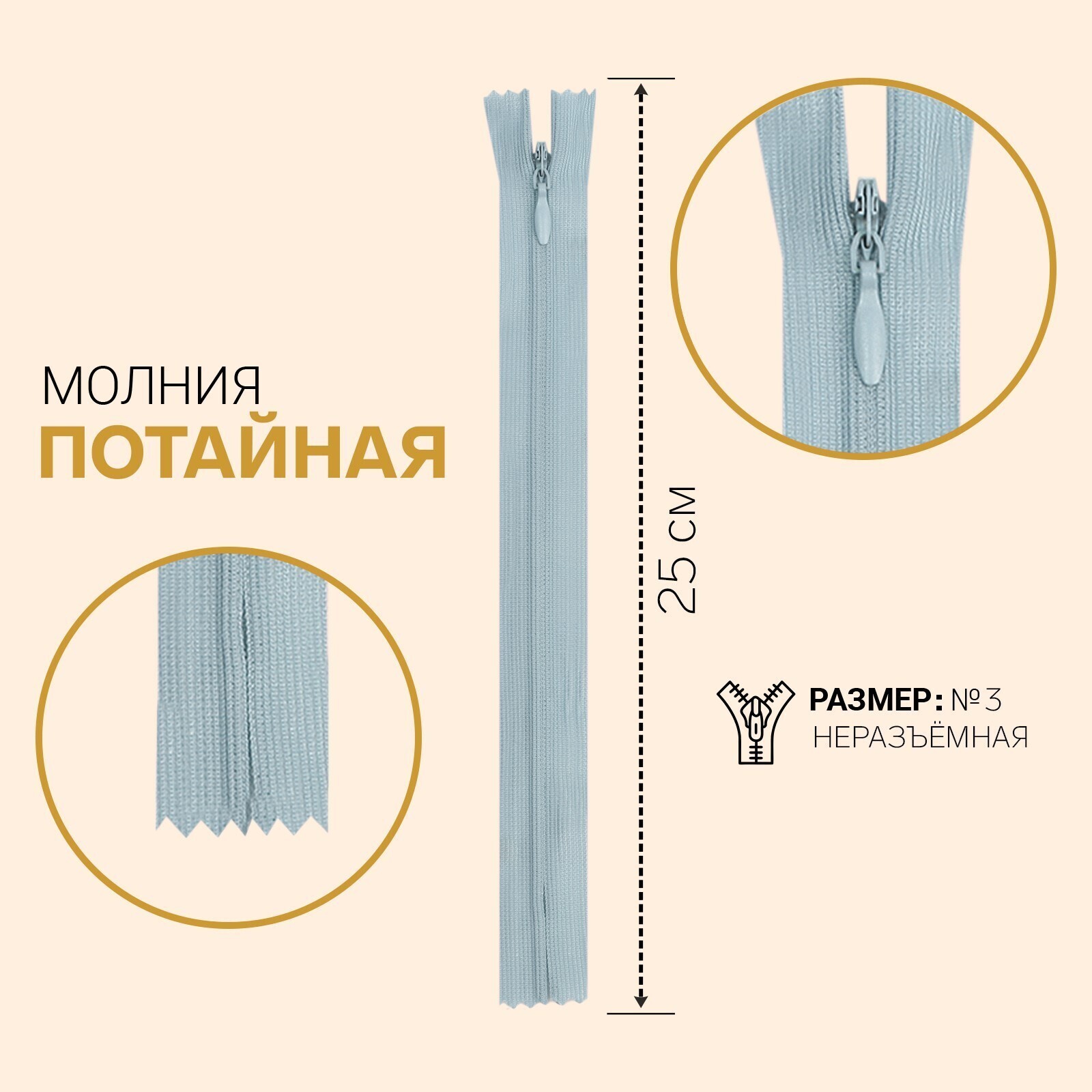 Молния потайная, №3, неразъёмная, замок автомат, 25 см, цвет голубой