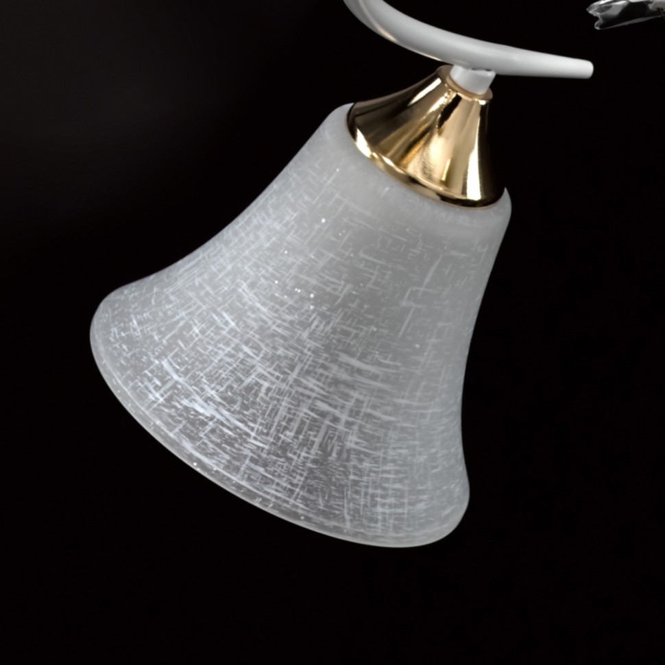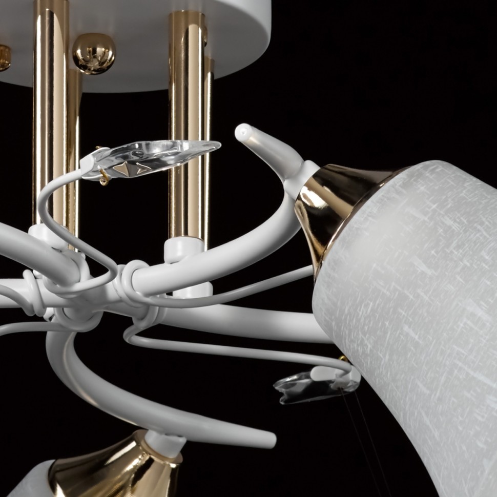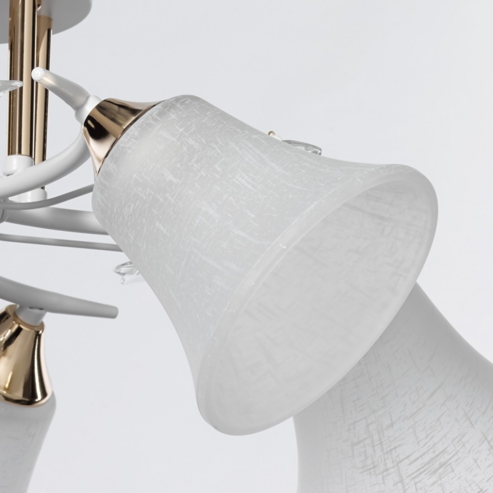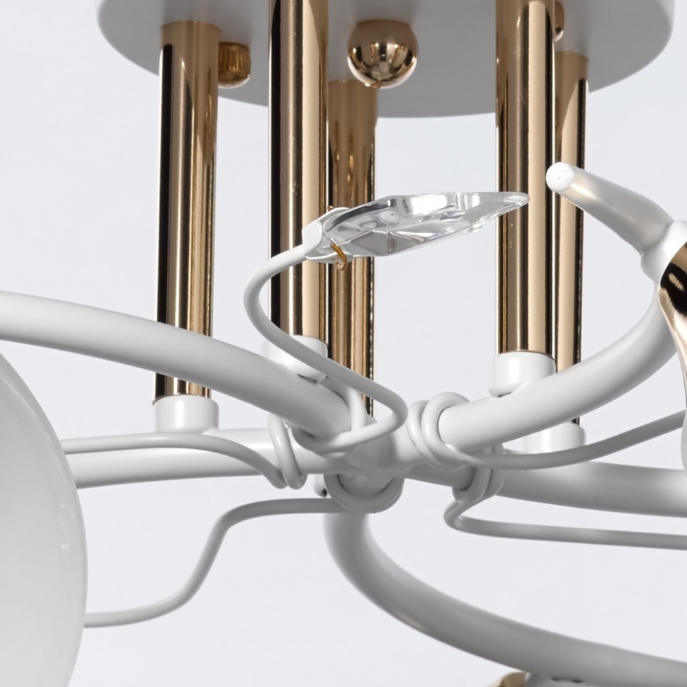 Актуальное сочетание металлов белого цвета и золота. Стеклянные матовые плафоны создают мягкий свет. Декор из хрустального стекла на рожках добавляет ноту романтики. Компактная высота модели идеальна для стандартной высоты потолка.