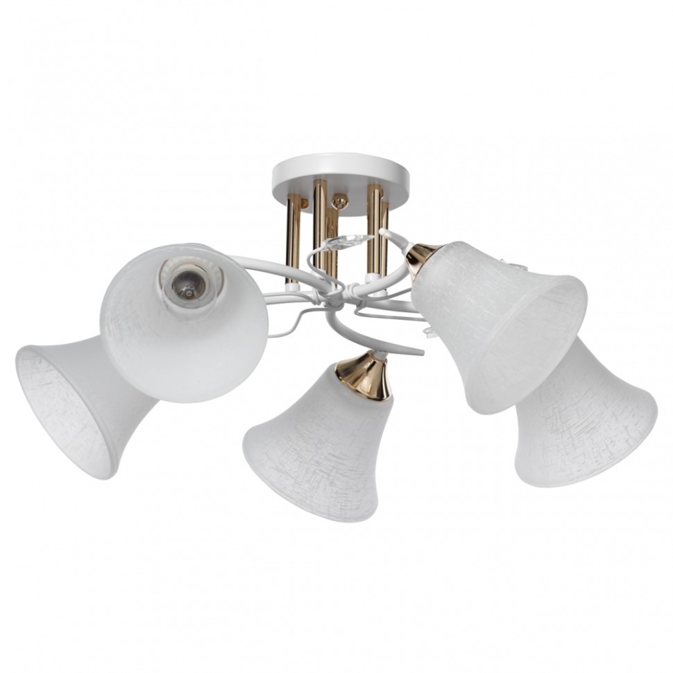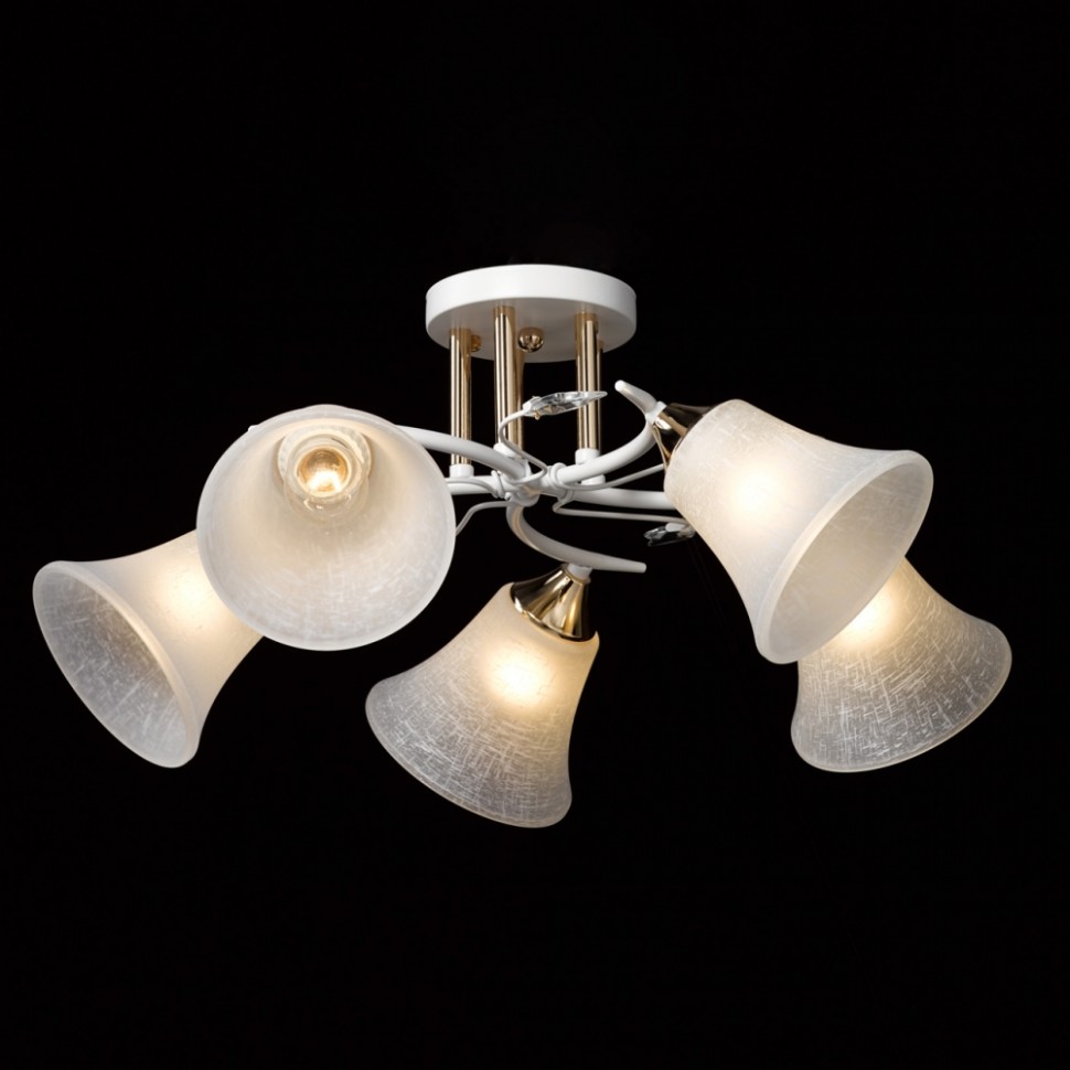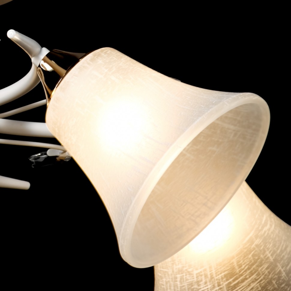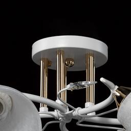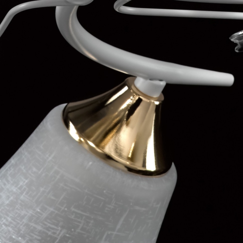 Актуальное сочетание металлов белого цвета и золота. Стеклянные матовые плафоны создают мягкий свет. Декор из хрустального стекла на рожках добавляет ноту романтики. Компактная высота модели идеальна для стандартной высоты потолка.