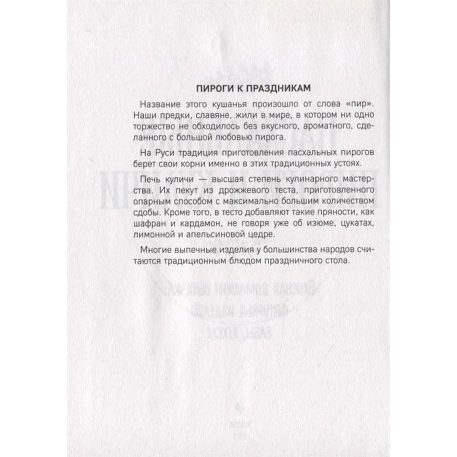 Чем нам так дорого приготовление к пасхальному празднику? Прежде всего радостью нового изобилия, которое начинается с Пасхой. Зима прошла, пост окончен, наступает время обновления всего сущего, в том числе и кулинарных приоритетов. Теперь мы снова готовим мясо, едим творог, сыр, яйца и, конечно, печем вкусную сдобную выпечку. В этой книге вы найдете множество рецептов куличей, сладких баб, кексов и специально в этом время готовящихся пирогов.