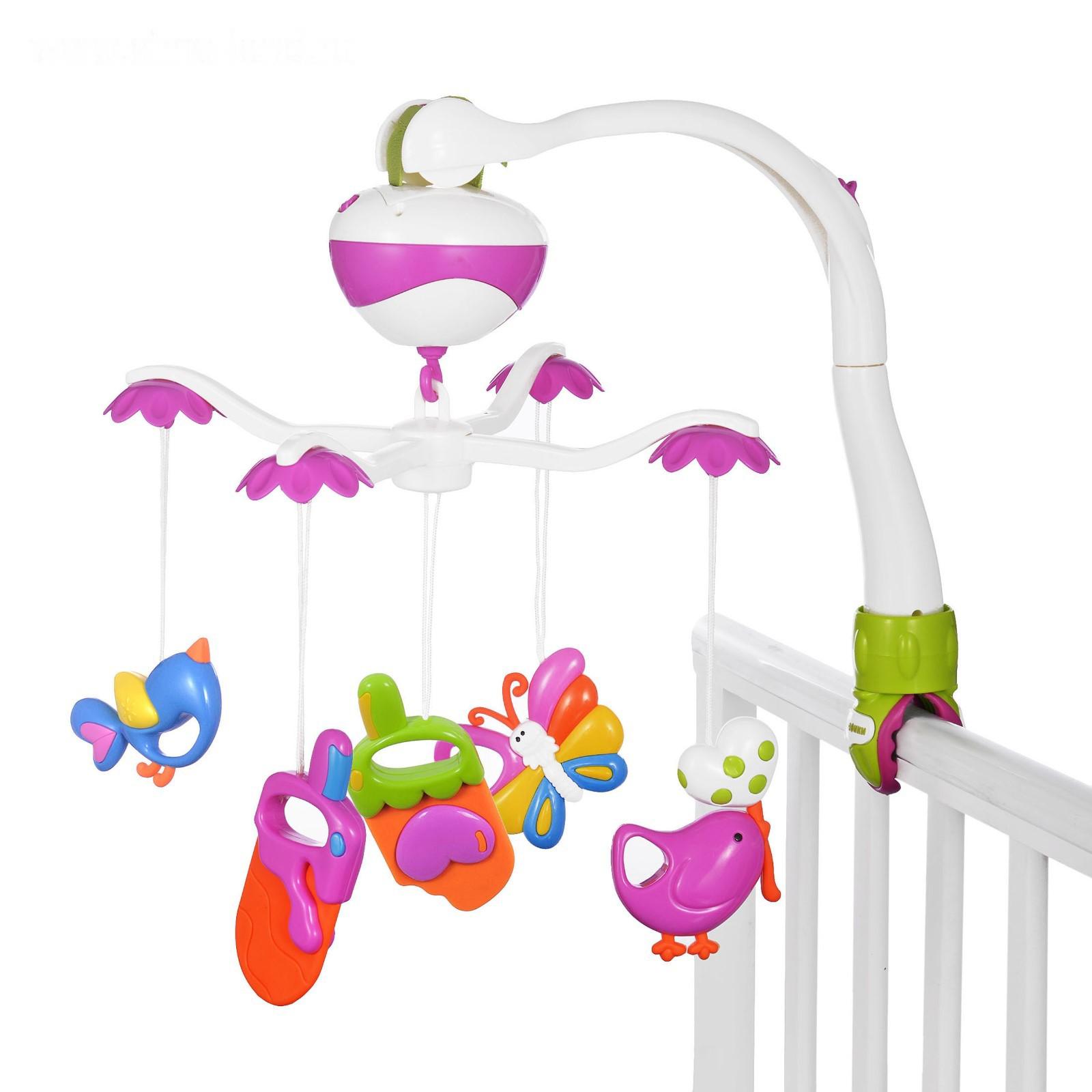 Изделие работает в двух режимах: кручение с музыкой и кручение без музыки. Для питания мобиля нужны 3 батарейки типа АА 1,5 V (в комплект не входят).