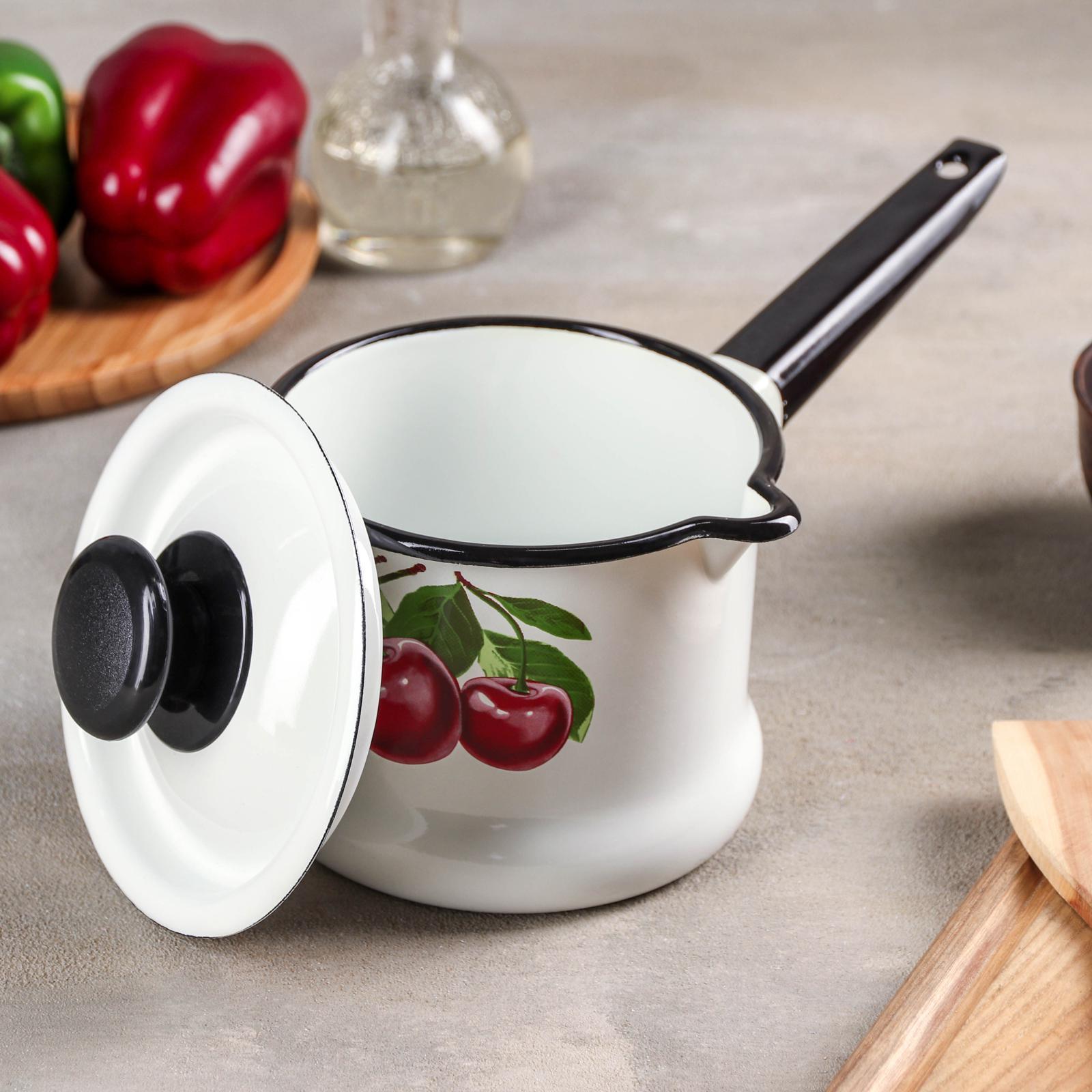 Ковш «Вишневый сад», 1 л, эмалированная крышка, металлическая ручка, индукция, цвет белый