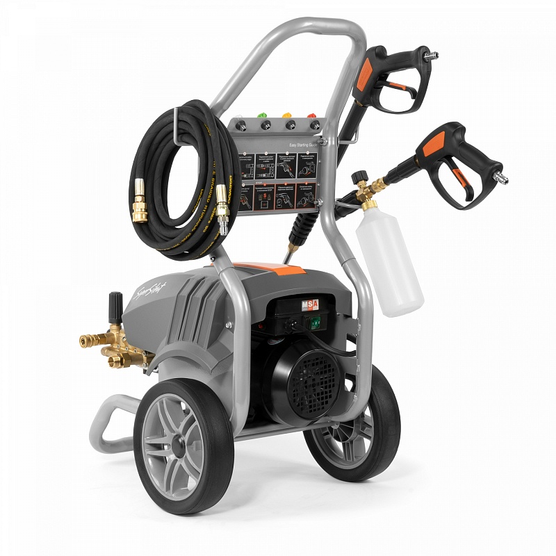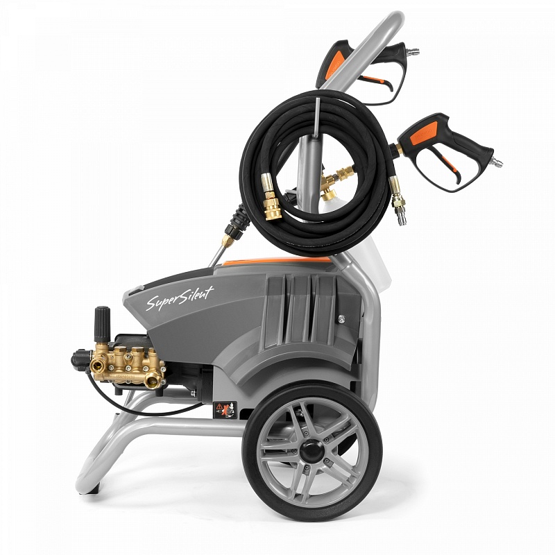 Из-за использования прочных материалов – стали, латуни, твердых полимеров, вес мойки составляет 46 кг, поэтому для транспортировки производитель предусмотрел удобную рукоятку и надежные резиновые колеса. При хранении мойка занимает немного места, все дополнительное оборудование, такое как пистолет и пеногенератор и шланги высокого давления, располагается на своих местах и не мешает перевозить агрегат.