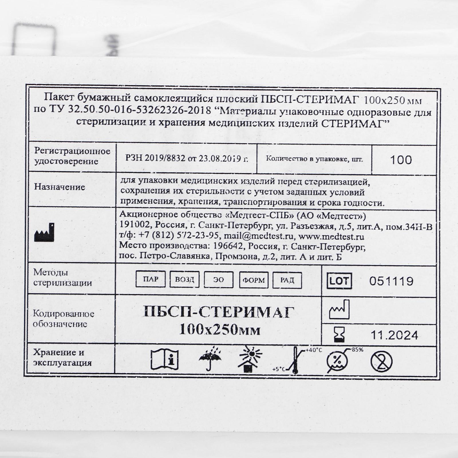 Пакеты бумажные самокл.для паровой, воздушной, этиленоксидной стерилизации, 100 х 250 мм