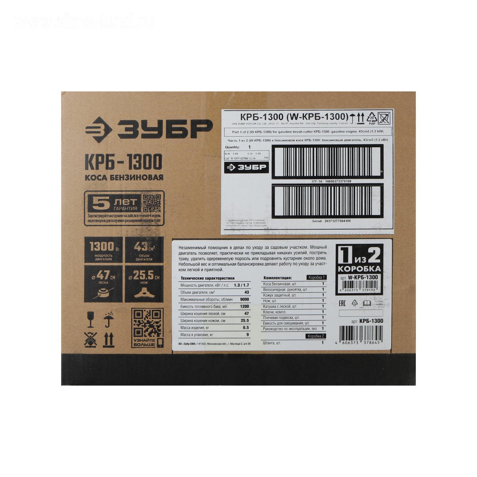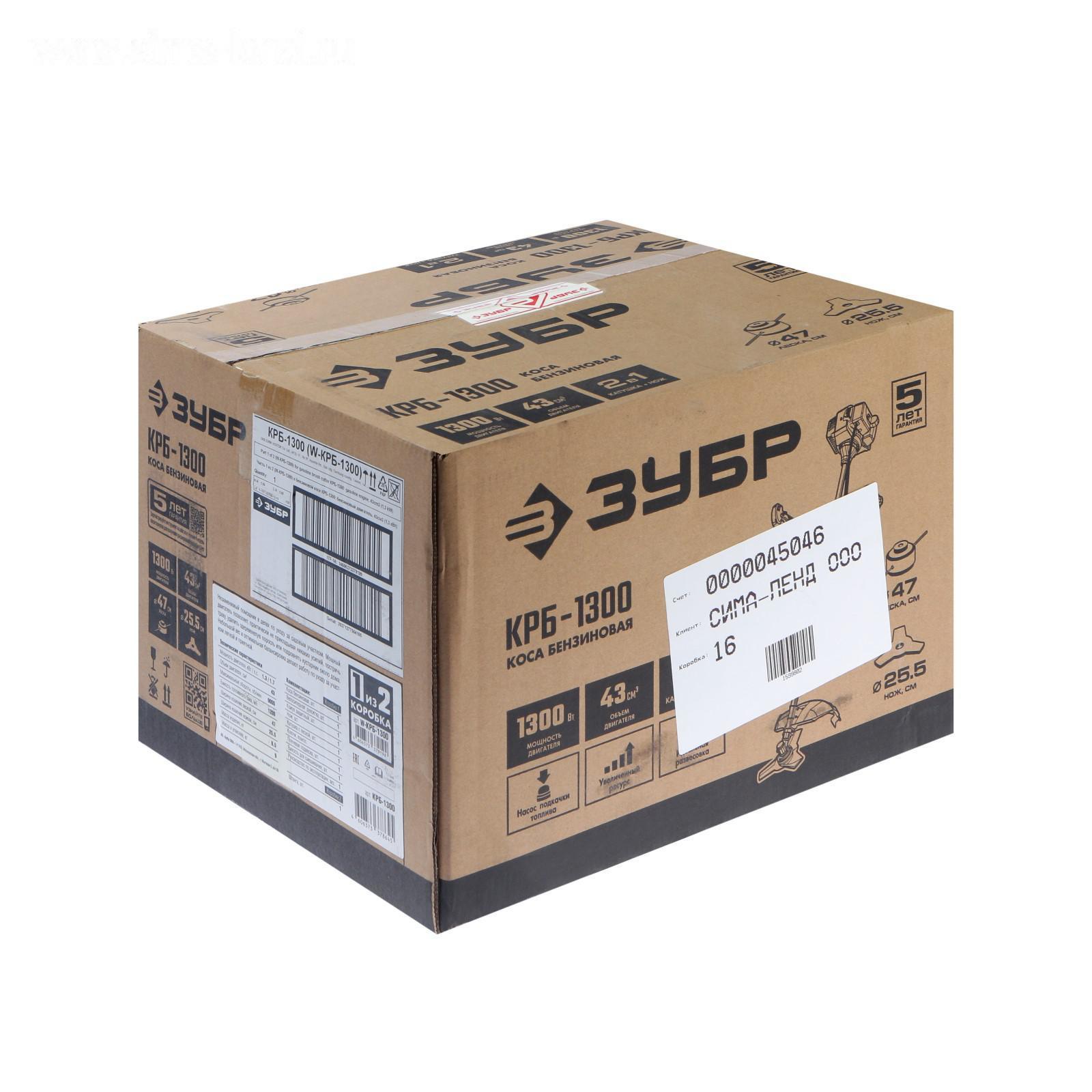 Триммер "ЗУБР" КРБ-1300, 2Т, 1300 Вт, 1.7 л.с., 43 см3, 9000 об/мин, скос 47 см, леска/нож