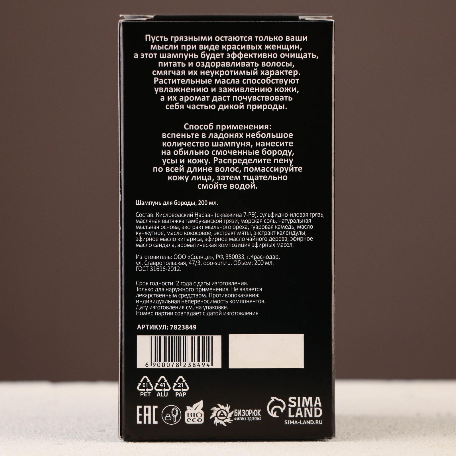 Шампунь для бороды (200 мл.): Кисловодский нарзан (скважина 7-РЭ), сульфидно-иловая грязь, масляная вытяжка тамбуканской грязи, морская соль, натуральная мыльная основа, экстракт мыльного ореха, гуаровая камедь, масло кунжутное, масло кокосовое, экстракт мяты, экстракт календулы, эфирное масло кипариса, эфирное масло чайного дерева, эфирное масло сандала, ароматическая композиция эфирных масел.